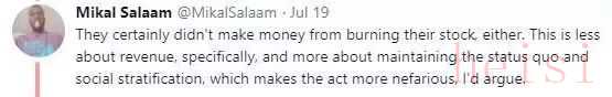 他們當然也沒有通過燃燒庫存來賺錢。我認為,這不僅僅是關于收入而是關于維持現(xiàn)狀和社會分層,這使得這種行為更加邪惡。
