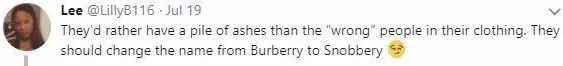 Lee: They’d rather have a pile of ashes than the “wrong” people in their clothing. They should change the name from Burberry to Snobbery .
