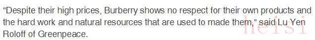 綠色和平組織的Lu Yen Roloff 抨擊道:“盡管價格如此高昂,但Burberry一點也不尊重自己的產(chǎn)品以及它們所消耗的自然資源?!?/p>