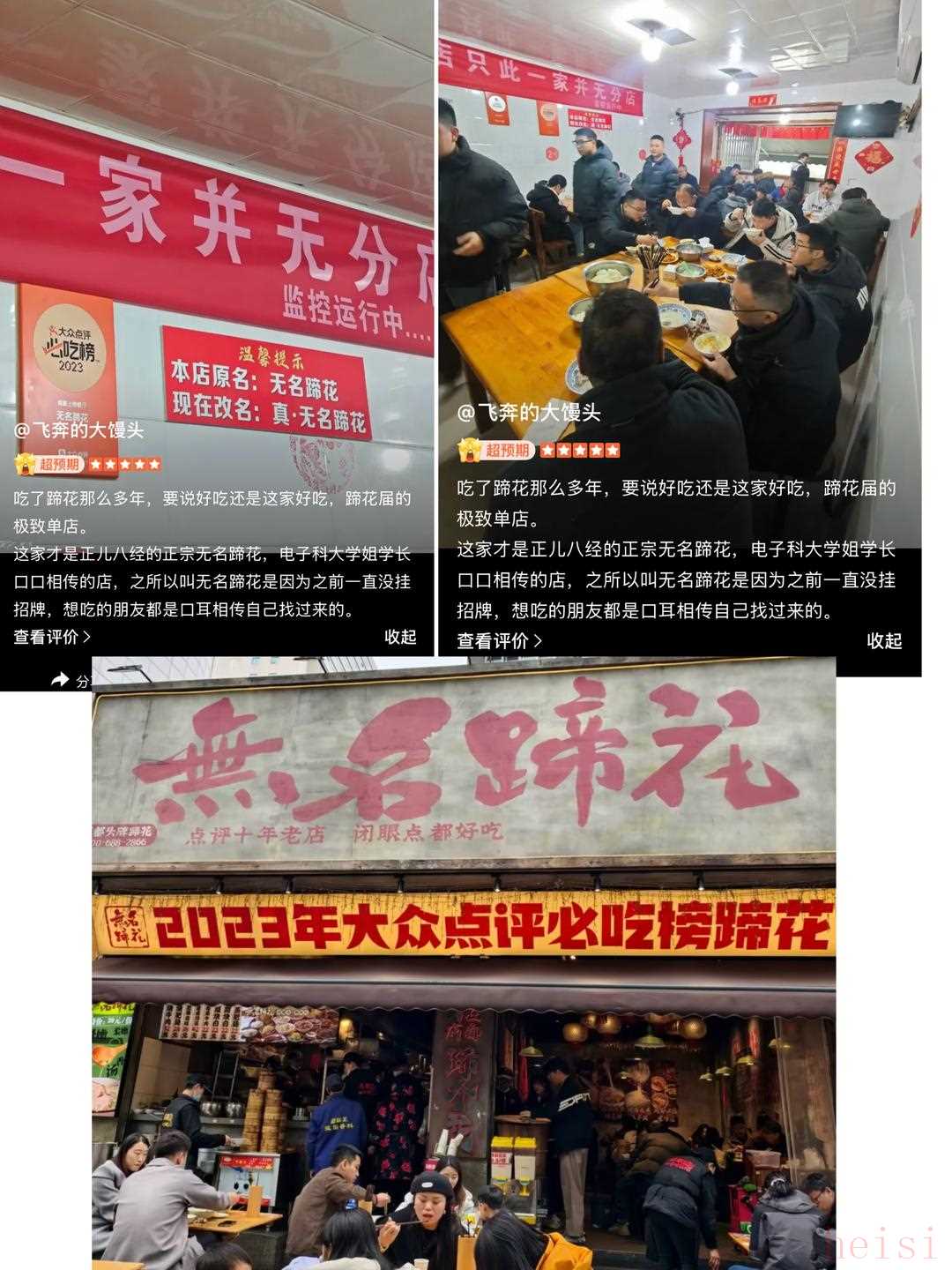 除無名冒菜外,在仿冒高新西區(qū)無名蹄花時(shí),他們也在同一條街開出同名店鋪。知情人士稱,這是想讓加盟商看到、相信,這就是老店。