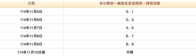 普發(fā)一萬(wàn)將從11月5日8時(shí)起開(kāi)放預(yù)先登記(5天),11月10日正式開(kāi)放登記,11月12日開(kāi)始入帳,并于2026年4月30日截止發(fā)放。(開(kāi)放登記前5日採(cǎi)身分證統(tǒng)一編號(hào)或居留證統(tǒng)一證號(hào)尾數(shù)分流,僅對(duì)應(yīng)的身分證統(tǒng)一編號(hào)或居留證統(tǒng)一證號(hào)尾數(shù)符合資格的民眾才能夠登記,11月10日開(kāi)始則不限尾數(shù),想要利用登記入帳的民眾都可以利用線上登記系統(tǒng)。)