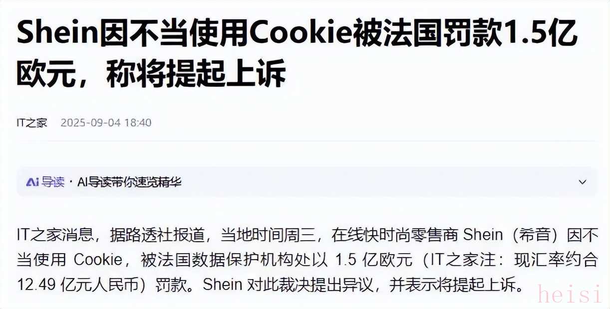 但就在之前,SHEIN卻遭到了法國監(jiān)管機(jī)構(gòu)CNIL的針對,說要對SHEIN處以1.5億歐元罰款,原因是該公司未能遵守有關(guān)訪問網(wǎng)站放置cookie的規(guī)則。