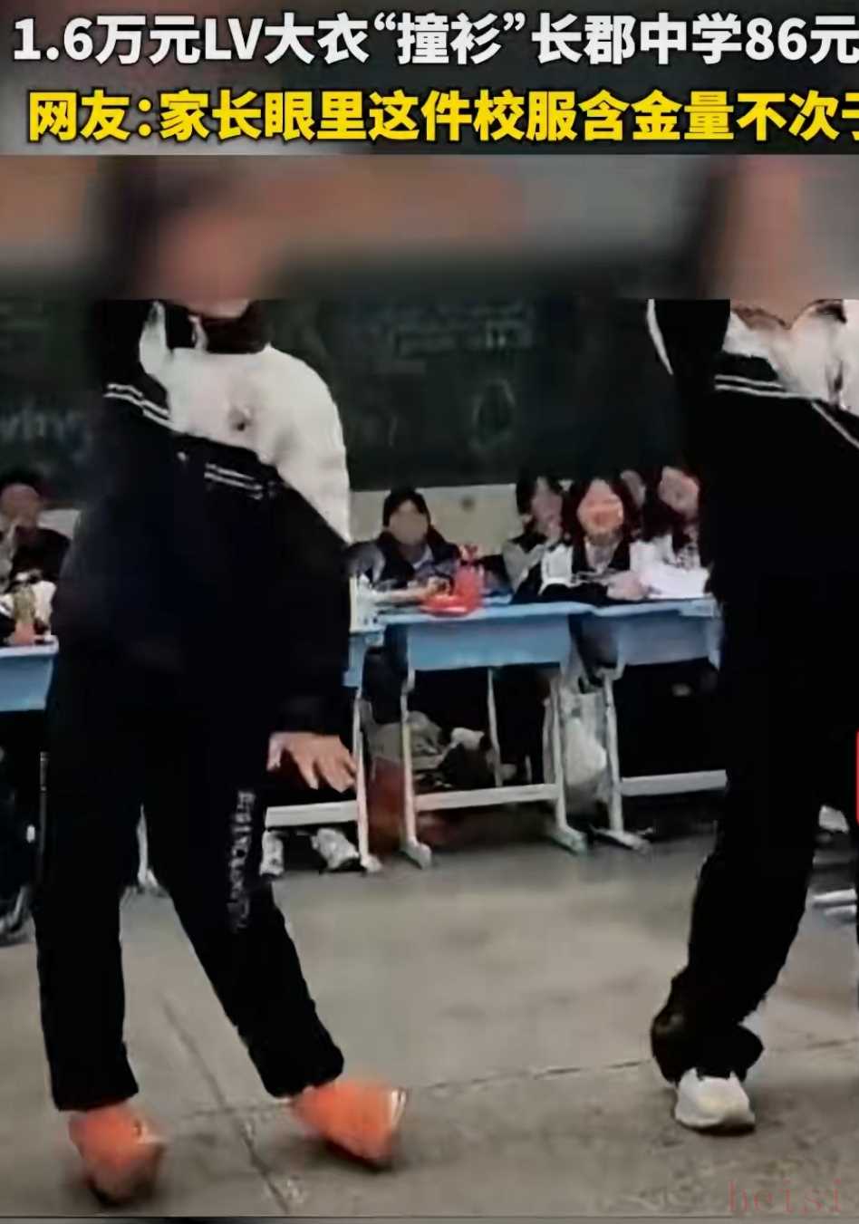 "“撞衫”": 指的是不同人穿著相同或極其相似的品牌服裝,尤其是在本應穿著校服的校園環(huán)境中,穿著奢侈品牌(如LV)的服裝與廉價的校服形成鮮明對比。