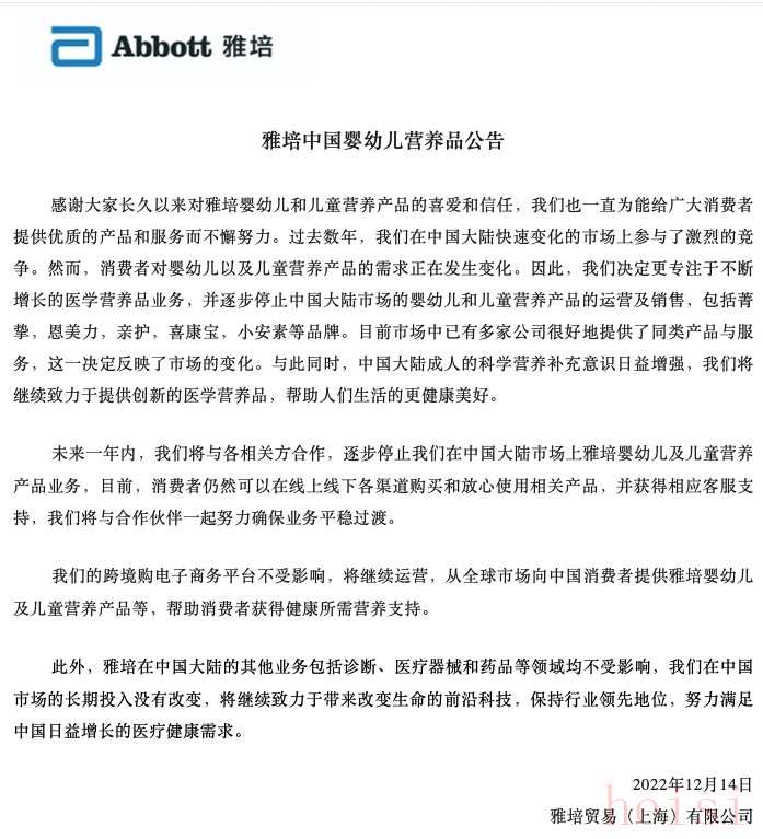 12月14日,雅培中國發(fā)布公告稱將進(jìn)行業(yè)務(wù)調(diào)整,重點發(fā)展醫(yī)學(xué)營養(yǎng)品業(yè)務(wù),并將逐步停止中國大陸市場的嬰幼兒和兒童營養(yǎng)品的運營和銷售,僅保留跨境渠道。
