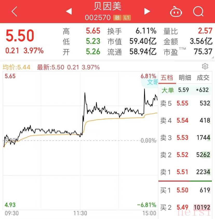 貝因美(002570.SZ)今日盤中拉升,一度漲超5%,截至今日(14日)A股收盤,貝因美股價上漲3.97%,報5.50元/股。