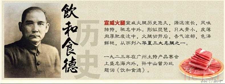 宣威火腿最遲始于明代。20世紀初,浦在廷等人集資興辦“宣和火腿公司”,引進機械設(shè)備制作火腿罐頭,繼而“云南宣威浦在廷兄弟食品罐頭有限公司”成立,其產(chǎn)品于1923年參加廣州等地賽會受到各界的好評。孫中山先生為其題詞“飲和食德”,從此名聲大著,遠銷香港、新加坡等地。