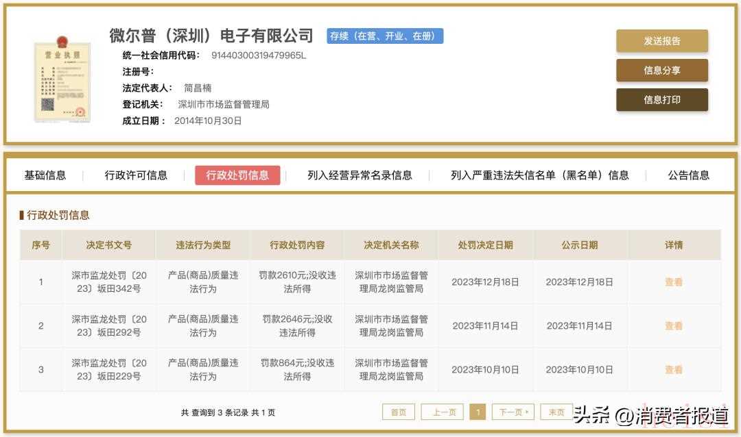 此外,關于產(chǎn)品質(zhì)量問題也備受消費者關注。在2023年10月到2023年12月期間,微爾普公司因產(chǎn)品(商品)質(zhì)量違法行為,接連三次被深圳市市場監(jiān)督管理局龍崗監(jiān)管局行政處罰。