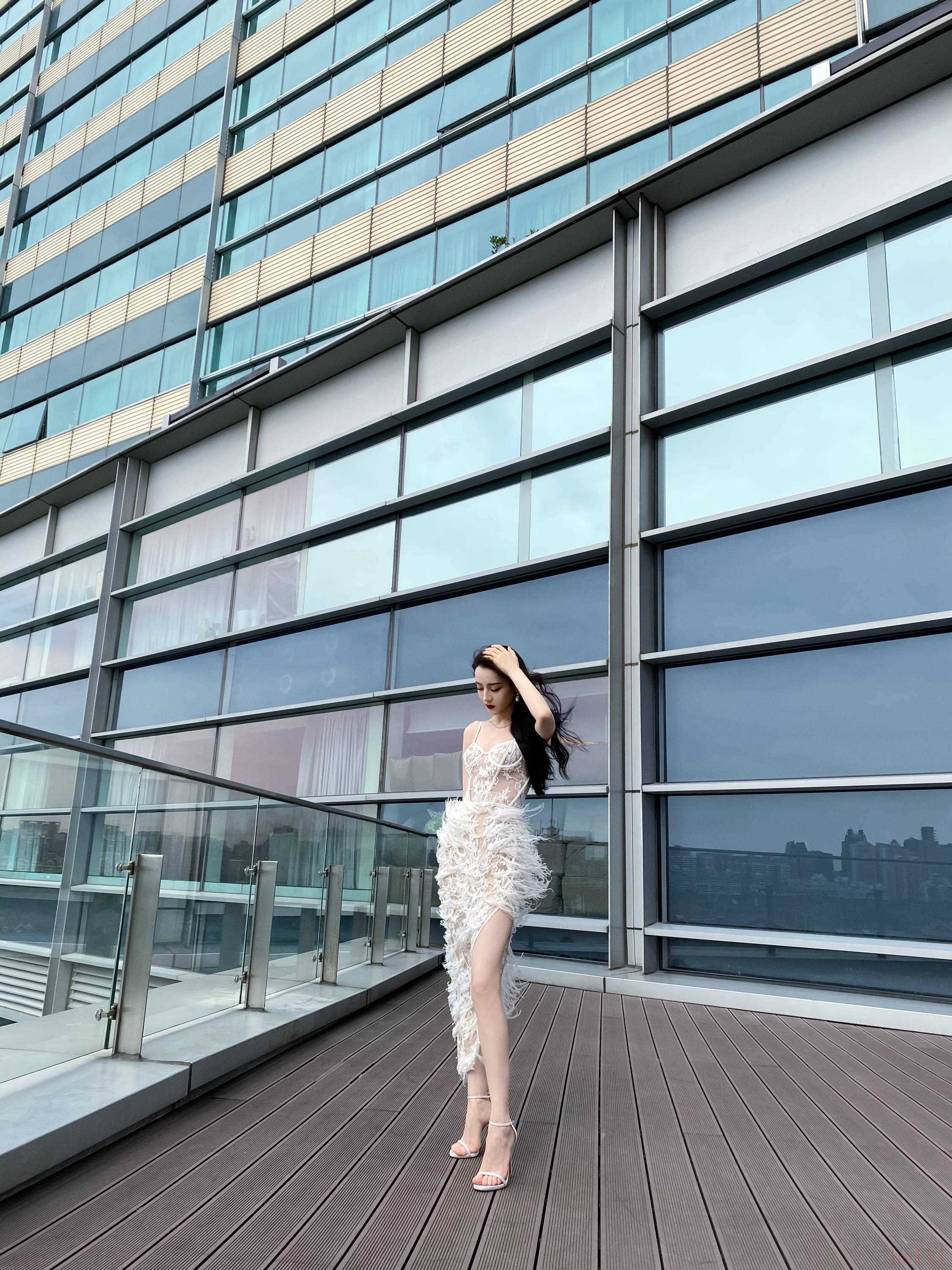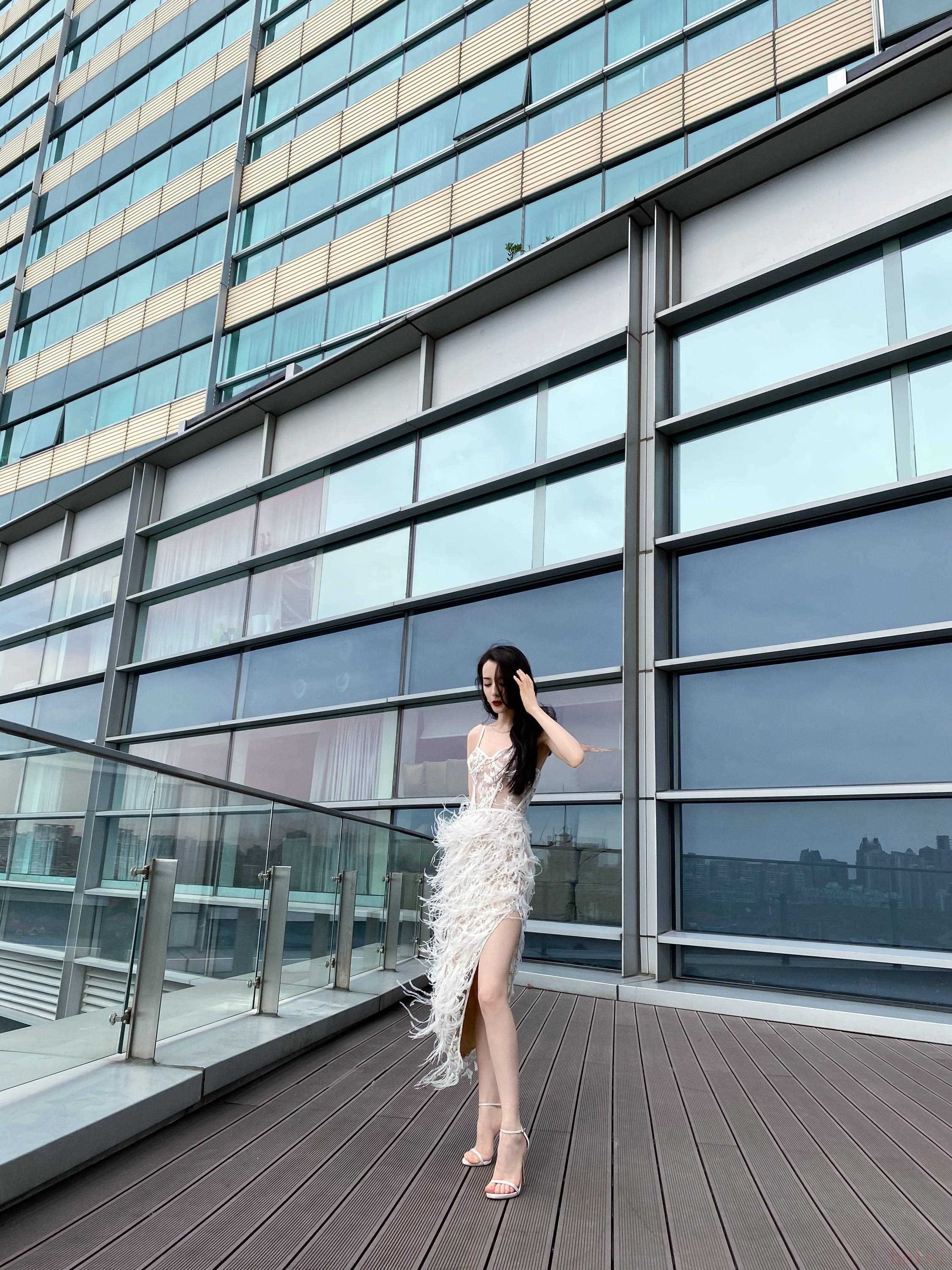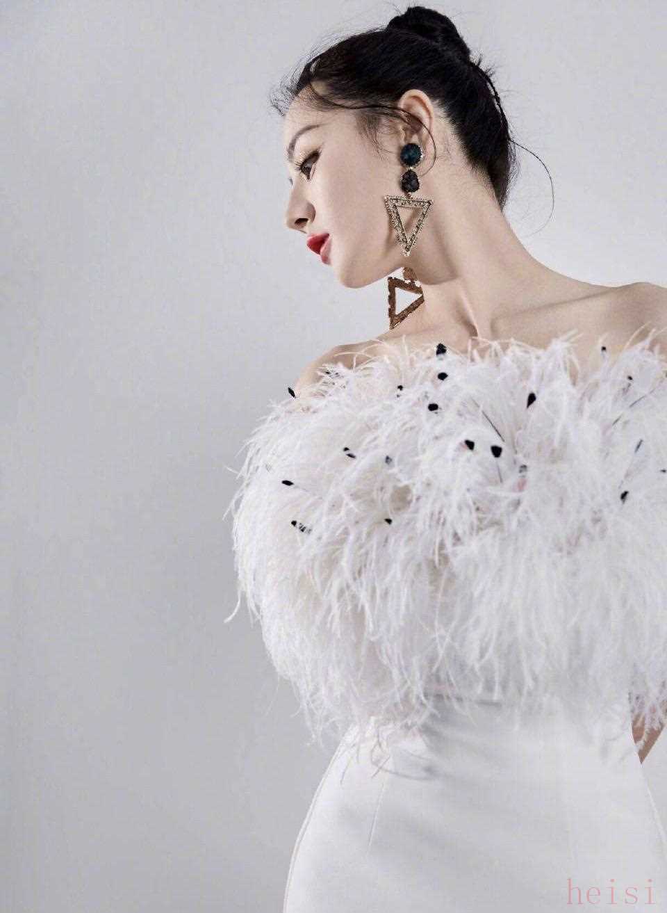 迪麗熱巴360度完美演繹,白色羽毛抹胸裙勾勒曼妙身姿