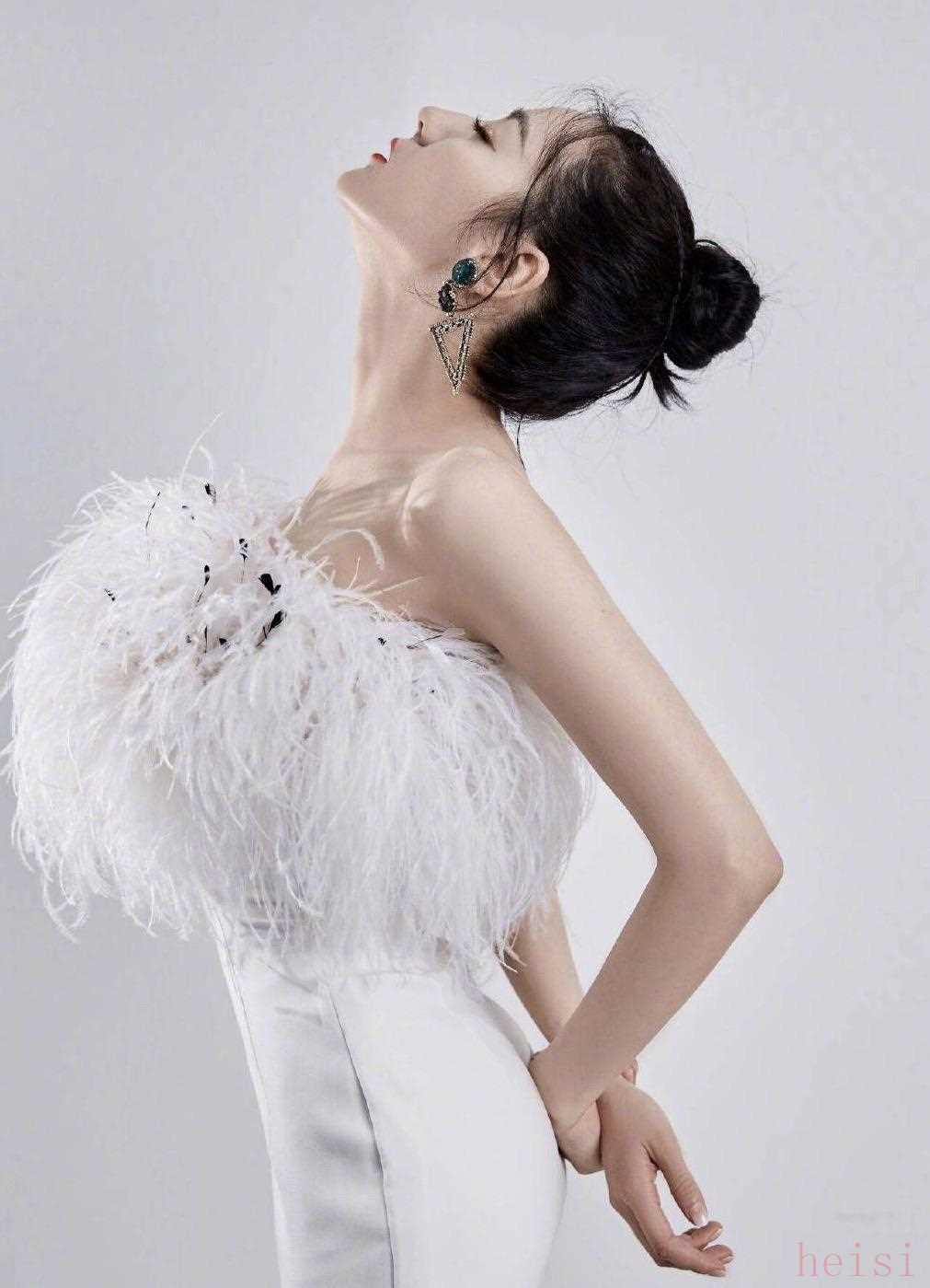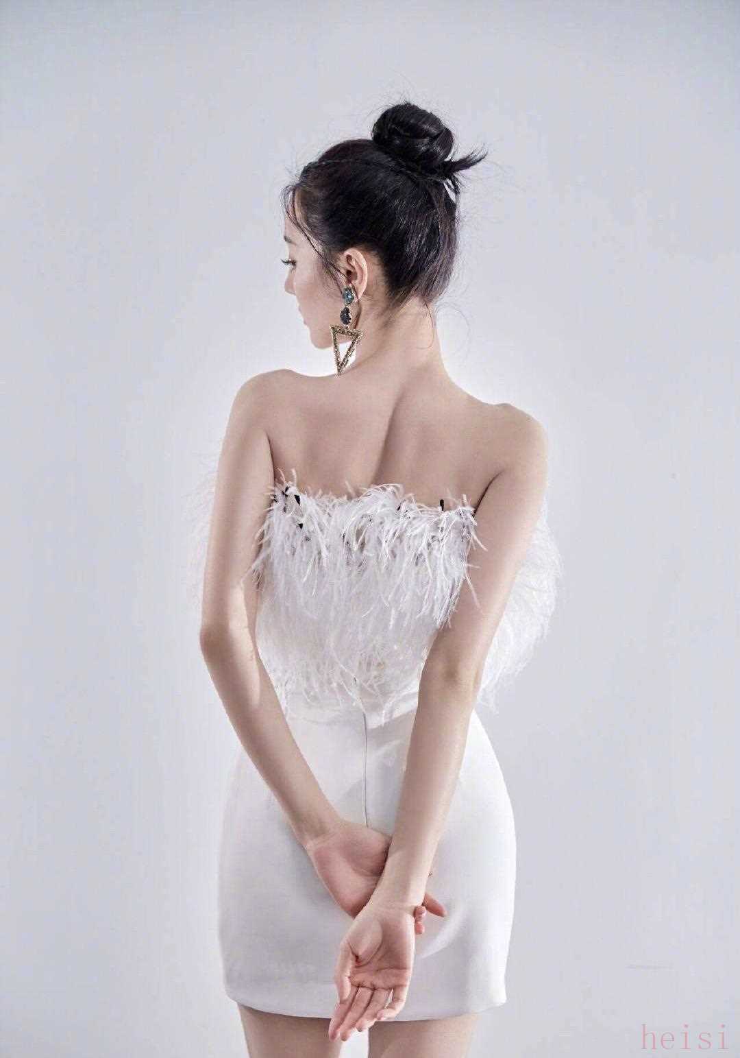 從背影看去,也顯出很美的肩頸曲線,背部線條優(yōu)美,羽毛和白色連衣裙的結(jié)合,更加展現(xiàn)出別樣的美感,背影都能看出濃濃的嫵媚感。
