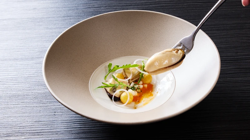 馬祖淡菜經(jīng)白酒清蒸后再以迷迭香奶油炭烤,底層搭配重新演繹的Romesco醬,融入杏桃與蜂蜜的果香,再以柚子汁提味。配上地瓜球增添綿密口感,柔和卻飽滿。