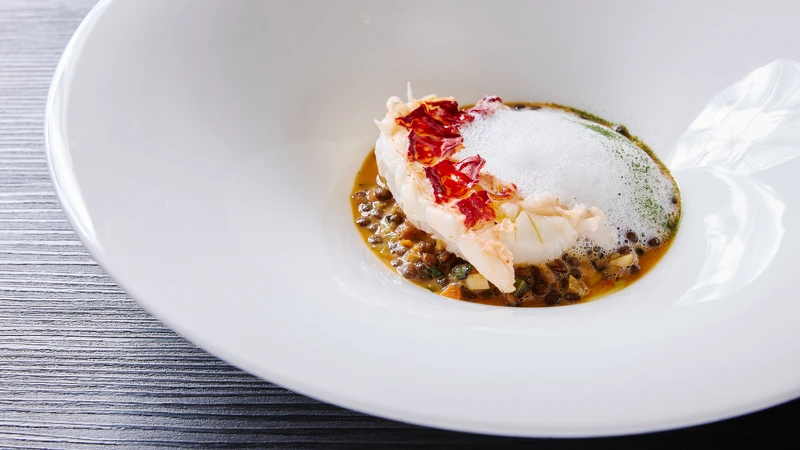 法國藍龍蝦外層微焦、內(nèi)里柔嫩,襯以以胭脂蝦高湯熬成的扁豆燉菜,煙燻培根香氣與白色香茅醬交織,香氣馥郁,口感層次豐富。