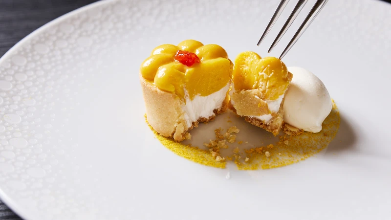 堅果塔皮酥香包裹Ricotta奶香內(nèi)餡,中央鋪上蜜柑果醬與果肉,酸甜分明。表層蜜柑凝乳色澤柔和,旁以葡萄柚冰與蜂花粉點綴,果香冷冽中帶微暖,余韻悠長。