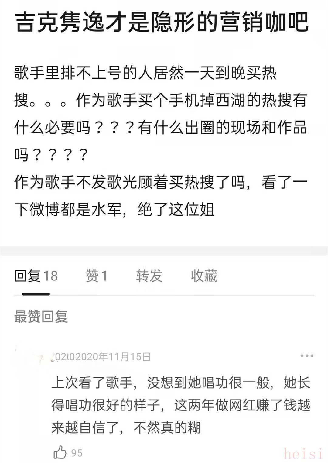 2018年11月,有網(wǎng)友發(fā)了一條跟吉克雋逸相關(guān)的“黑評(píng)”。隨后,吉克雋逸幾個(gè)當(dāng)事人陸續(xù)點(diǎn)贊,將這個(gè)網(wǎng)友卷進(jìn)了一場(chǎng)網(wǎng)絡(luò)暴力戰(zhàn)。