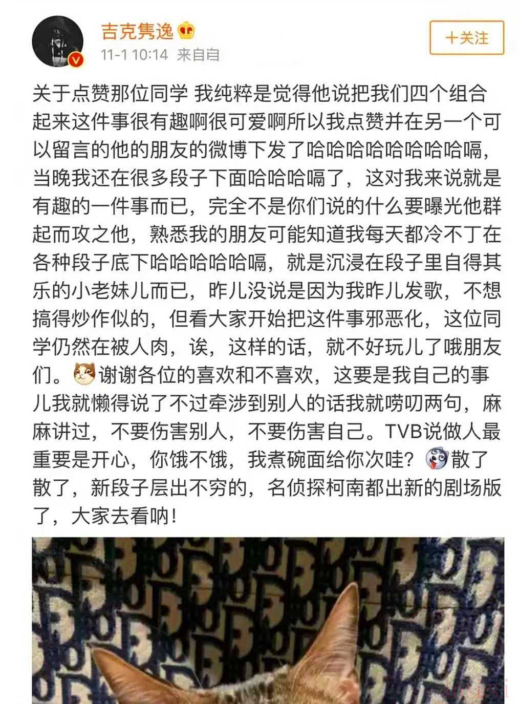 從頭到尾,吉克雋逸不僅沒有做出回應(yīng),錄制節(jié)目時(shí)穿的還是該品牌的衣服。