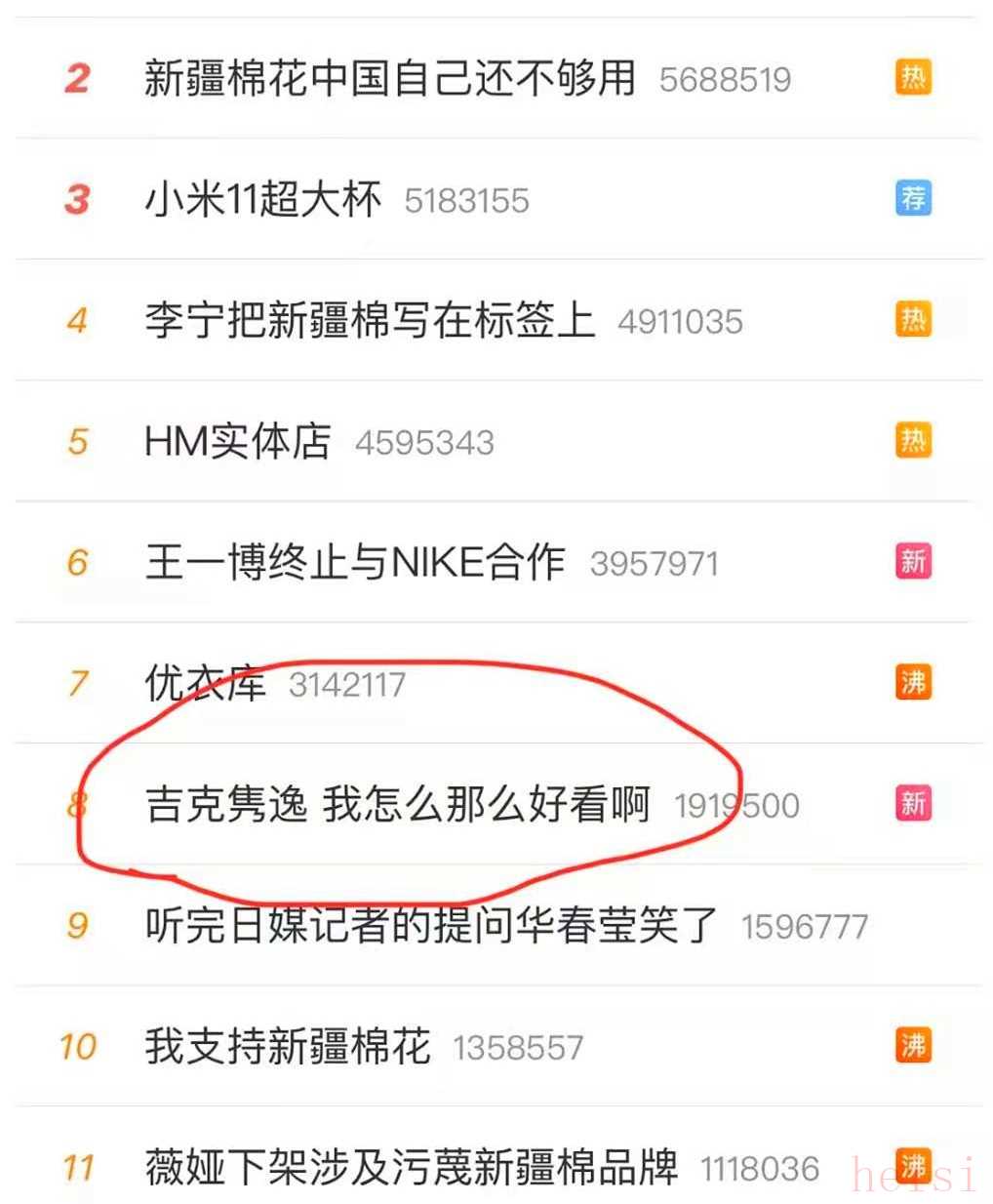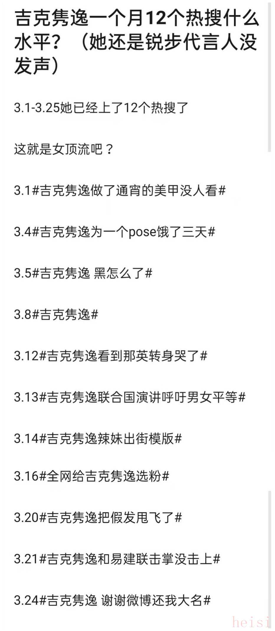 今年3月1日至25日,吉克雋逸就有12個(gè)熱搜,而且多是美甲、假發(fā)、黑了、哭了等毫無力度的話題。