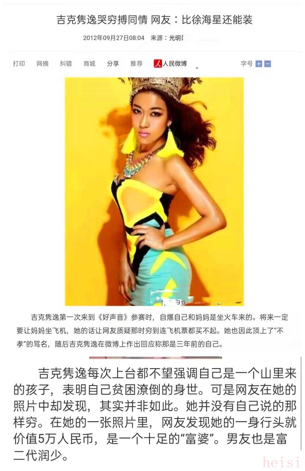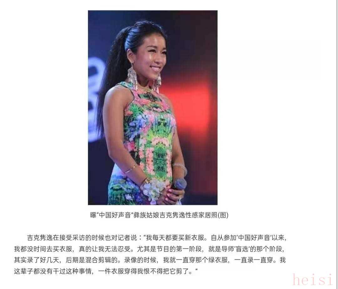 但是2012年,吉克雋逸參加《中國(guó)好聲音》時(shí),明眼人一看就是做了皮膚“美黑”效果,她卻解釋為彝族人的特點(diǎn)就是膚色很黑,自己還算是白的。