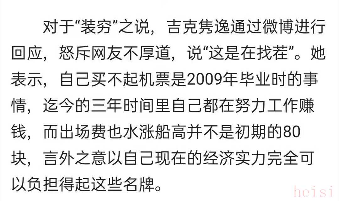 而她在社交平臺(tái)曬出的照片里,更是以一身名牌出鏡,全部行頭加起來近5萬元。被曝“裝窮”后,吉克雋逸回應(yīng)“這是在找茬”,稱自己在節(jié)目中說的是3年前。