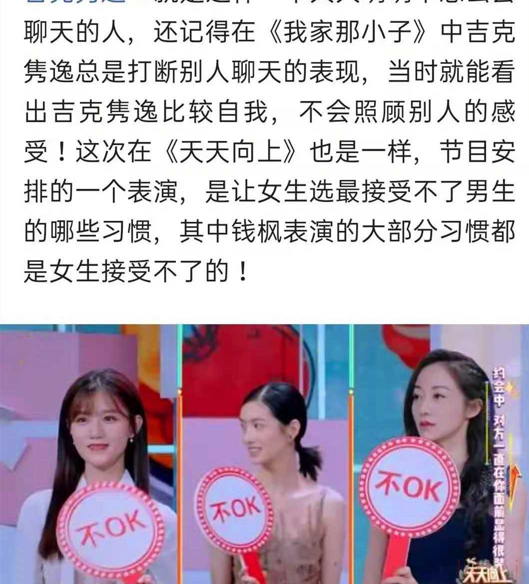 某期《天天向上》中,節(jié)目安排了一個(gè)環(huán)節(jié),讓女生選出不能接受的男生習(xí)慣。其中錢楓表演的,其他女嘉賓都選了不OK,只有吉克雋逸表示可以,還加了一句“我沒有那么多事兒”。