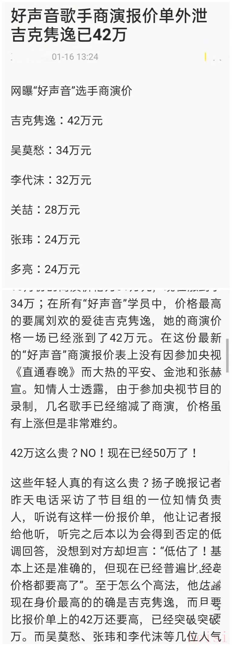 同期好聲音學(xué)員中,她的商演價(jià)格最高,一場(chǎng)演出開價(jià)50萬。這種情況下,難怪連600萬的代言費(fèi)都看不上。簽約新公司時(shí),身價(jià)更是高達(dá)2000萬。