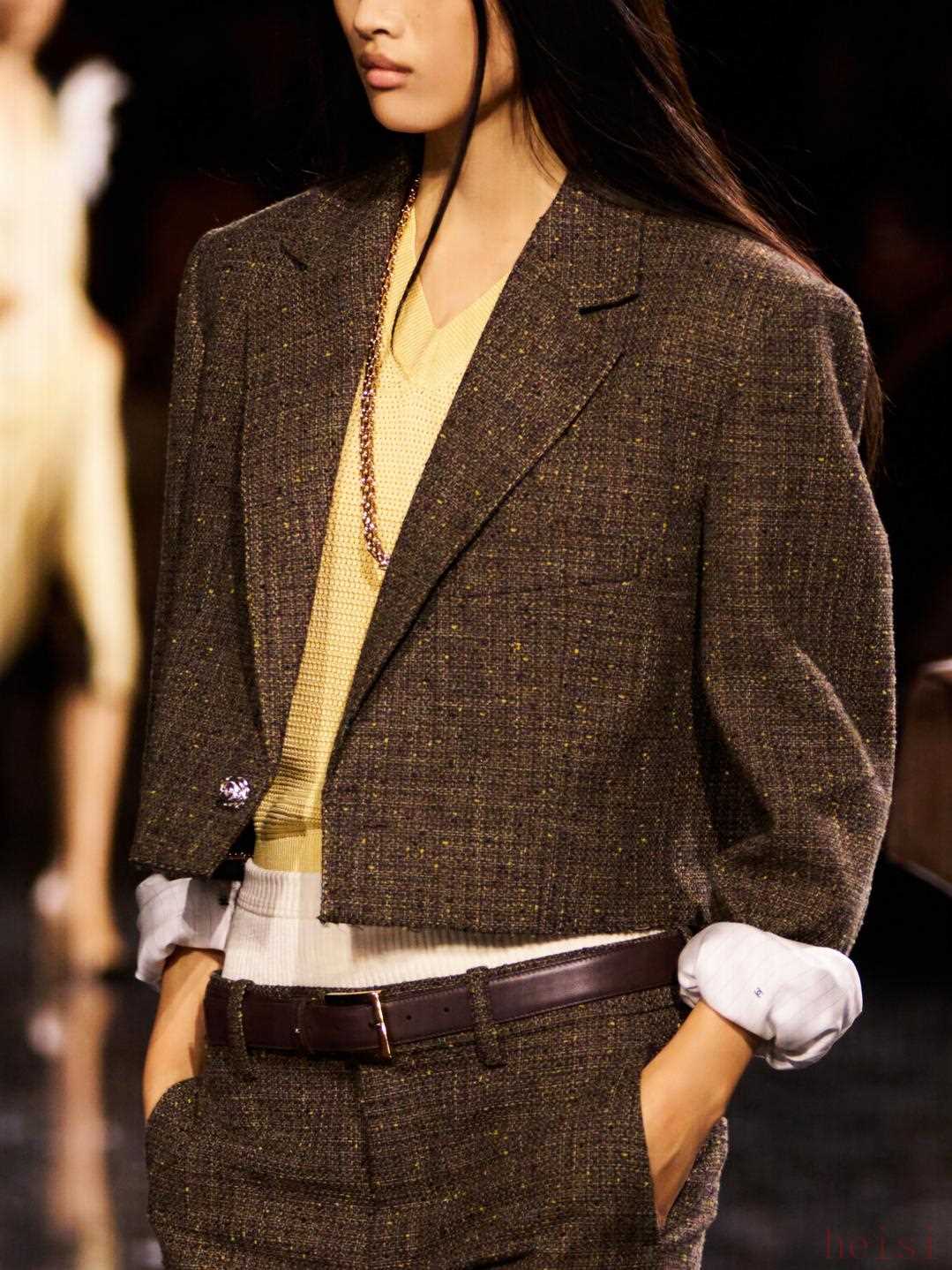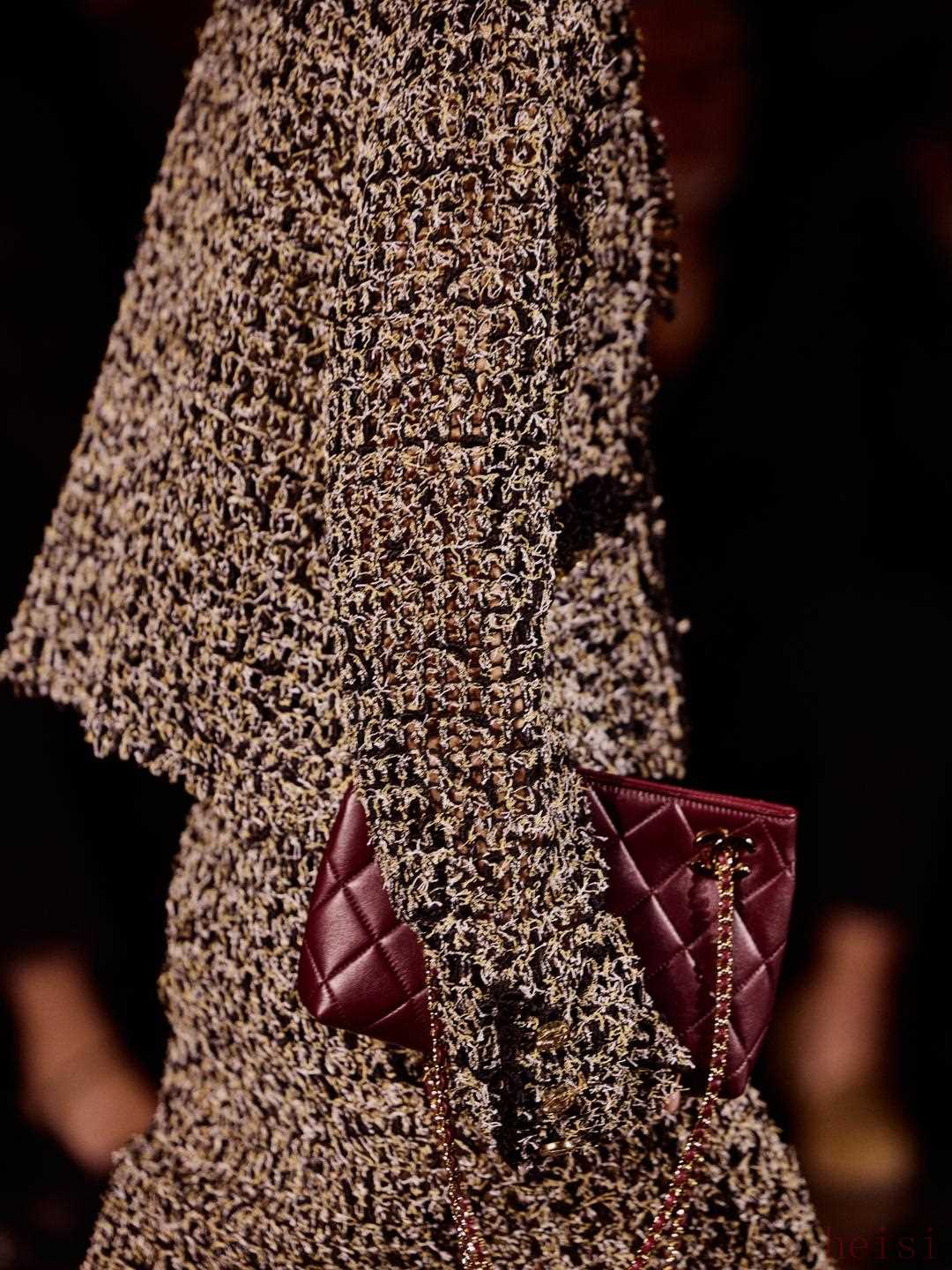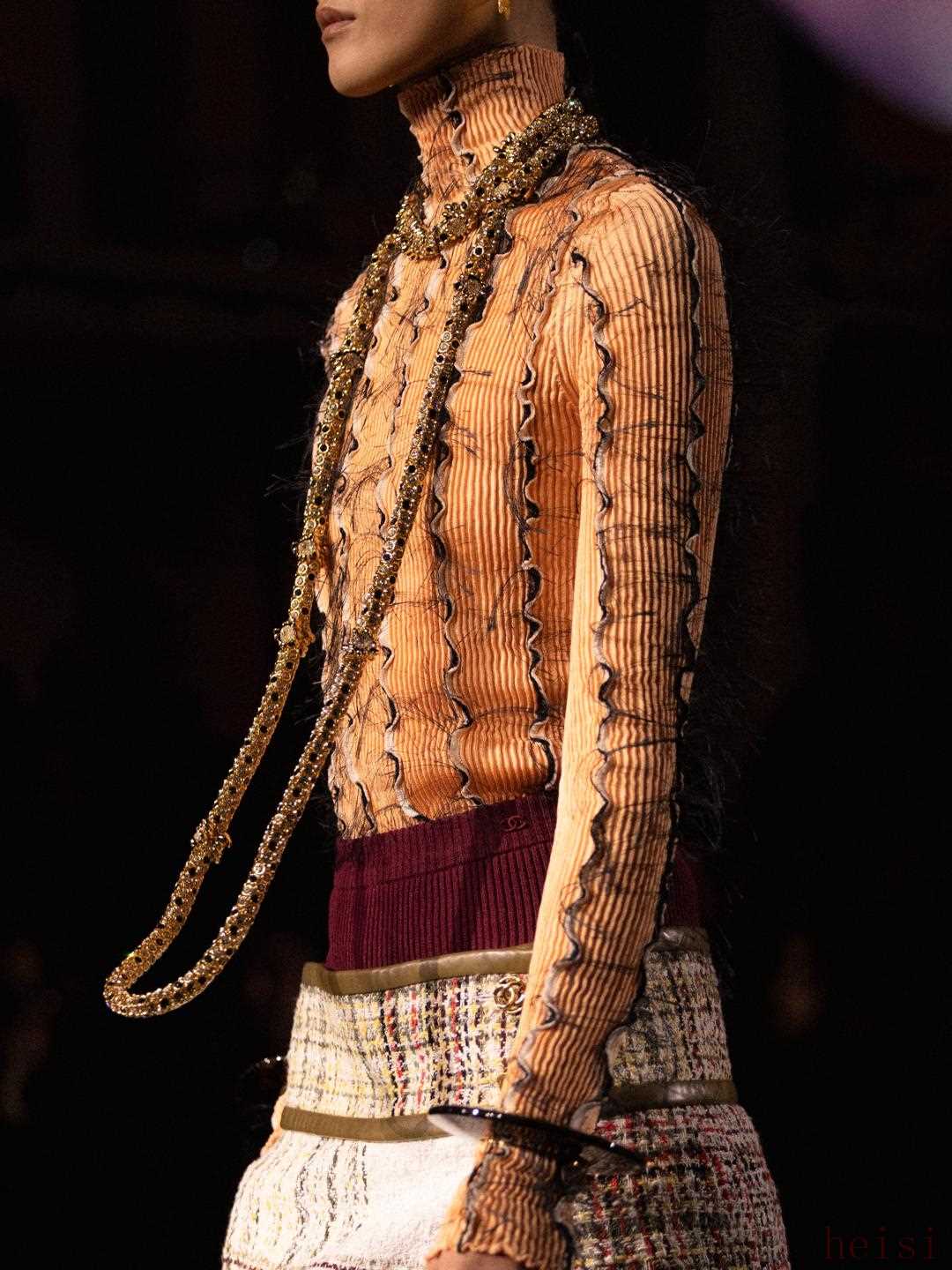 多次出現(xiàn)的未經(jīng)修飾的邊緣,與極致的喜愛共鳴。過去,英國(guó)的貴族會(huì)把一件衣服穿到破爛不堪,Gabrielle Chanel著迷于此,認(rèn)為這是一種時(shí)髦與優(yōu)雅。而這種極致的鐘愛,不正因在當(dāng)下的稀缺,而顯得奢侈?