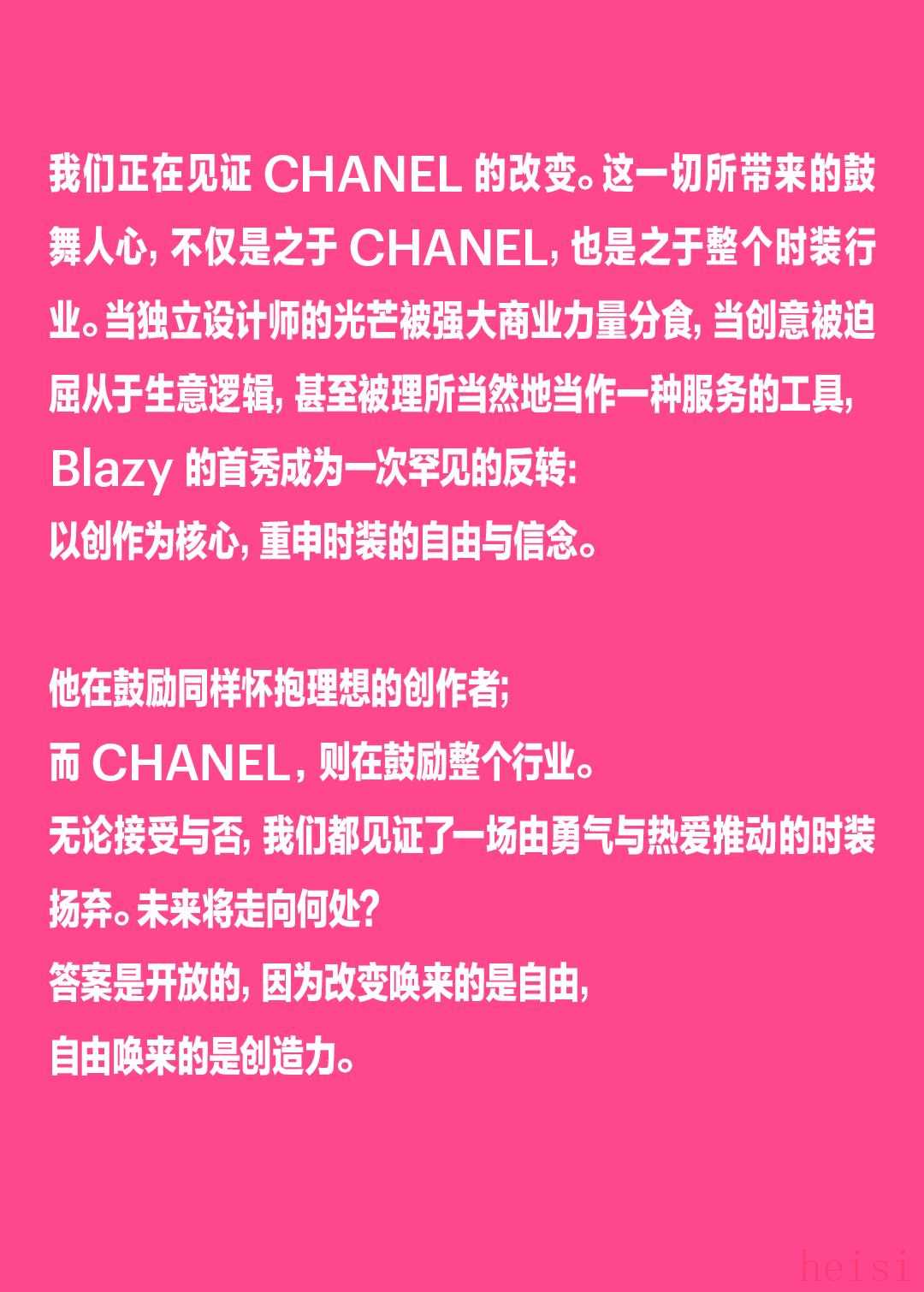 我們與 Pavlovsky 展開了一場(chǎng)對(duì)話。對(duì)我們而言,這不僅是為了更好地理解 CHANEL 作為一個(gè)品牌的愿景所在,也因?yàn)樗囊暯翘峁┝肆硪环N了解Blazy的線索。