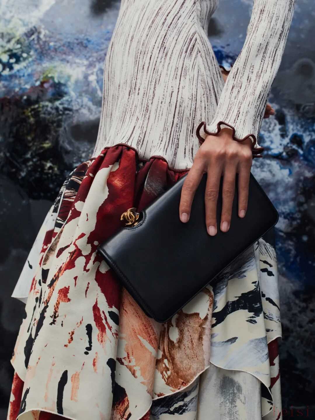 我們可以將這種處理,與系列中以“使用過的狀態(tài)”重釋的2.55手袋并行來(lái)看。Blazy在包袋邊緣植入可隨意扭曲的金屬,使柔軟皮革在塑形中呈現(xiàn)出被時(shí)間觸摸過的痕跡。對(duì)他而言,這種“使用過”是一種源于喜愛的反復(fù)佩戴,是時(shí)間與傳承共同留下的印記。重塑后的2.55手袋因此更顯珍貴,那些被扭曲的邊緣,仿佛是一次因愛產(chǎn)生的深擁而留下的輪廓。