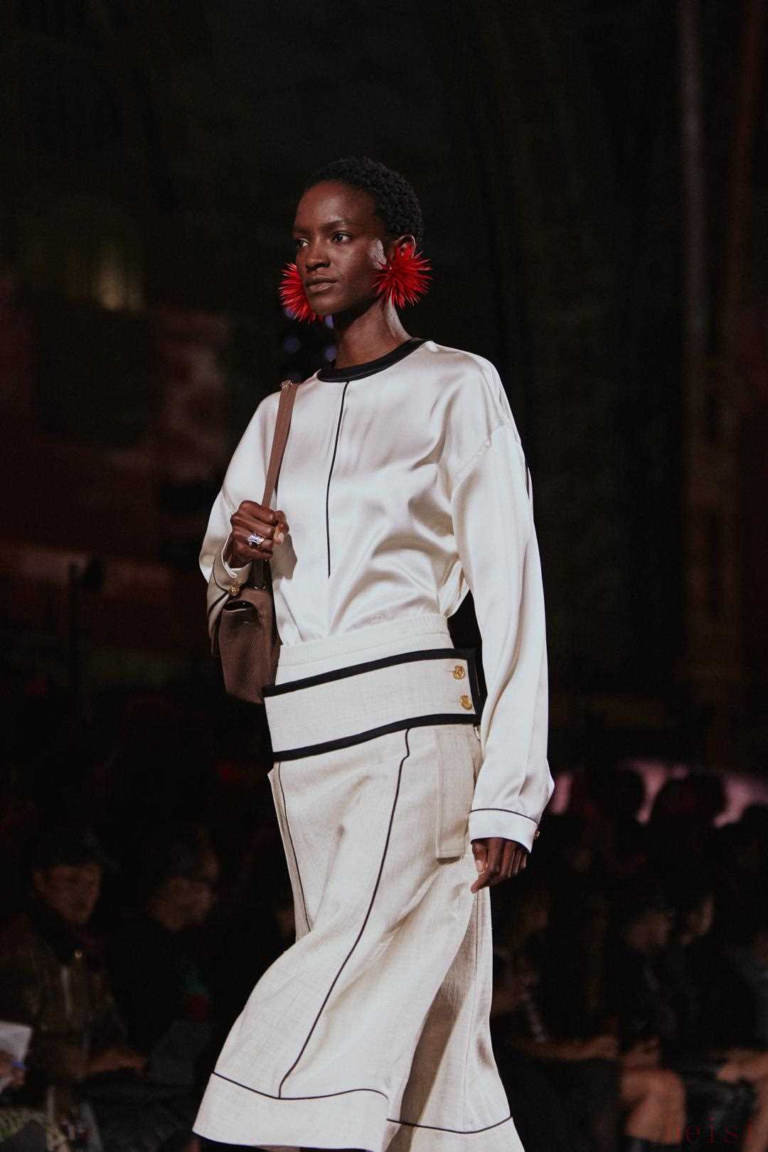 Blazy定下了基調(diào):一個(gè)松弛、摩登、剛毅卻依然充滿魅力的女性形象浮現(xiàn)眼前,“工作的時(shí)間”與“愛的時(shí)間”在此交織,絲緞的流動(dòng)感、垂褶領(lǐng)的設(shè)計(jì),使針織裝束從日間的低調(diào)延展至夜晚的戲劇性,女性與男性氣質(zhì)并置。