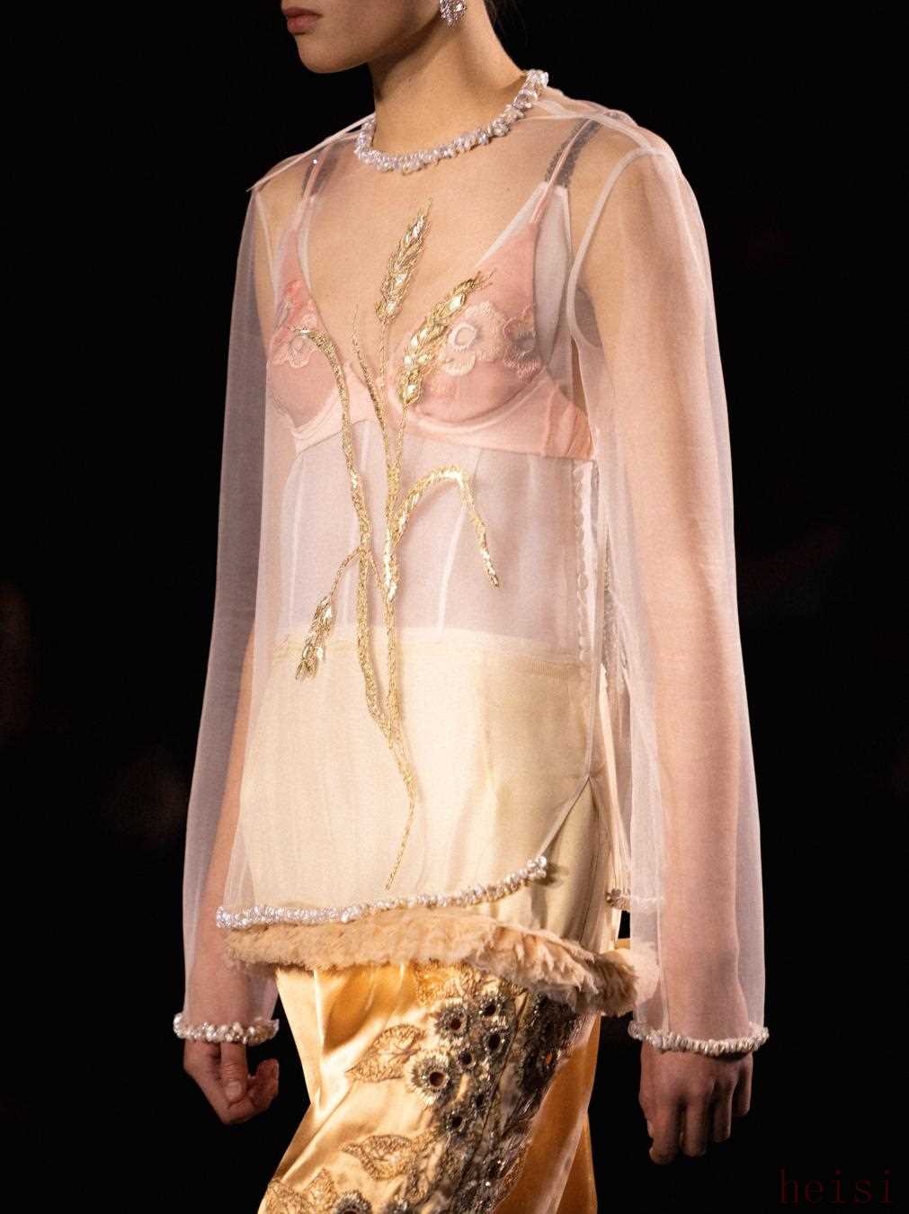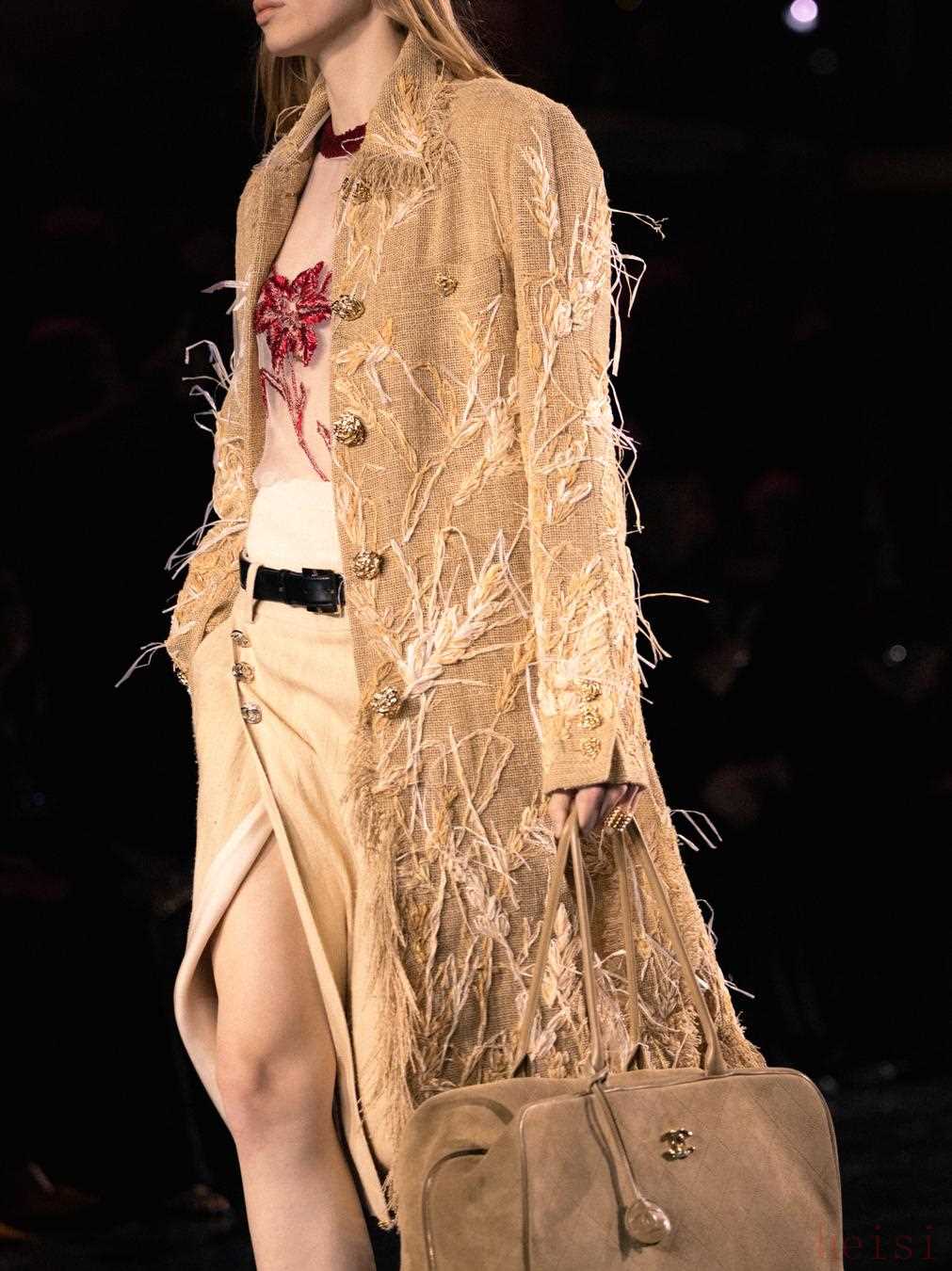 Blazy在面料上進(jìn)行了大量的鉆研、開發(fā)和發(fā)展,以至于這個(gè)系列呈現(xiàn)的大多數(shù)衣服都顯得如此的獨(dú)一無(wú)二。據(jù)悉,他花了三個(gè)月來(lái)開發(fā)一種絲綢斜紋布,Gabrielle Chanel曾經(jīng)為自己定制過男士斜紋褲以方便自己騎馬,現(xiàn)在Blazy將她的這份反叛和她對(duì)絲綢的愛好結(jié)合,做成了全新的絲綢斜紋布長(zhǎng)褲。Blazy還知道她對(duì)于自然面料的情有獨(dú)鐘,以新棉紗織成的長(zhǎng)款外套,上面以干草一般的材質(zhì)刺繡出麥穗的圖樣,把整個(gè)外套變成了一幅抽象畫,領(lǐng)子則延續(xù)了首個(gè)look即存在的未經(jīng)修飾的邊緣處理。