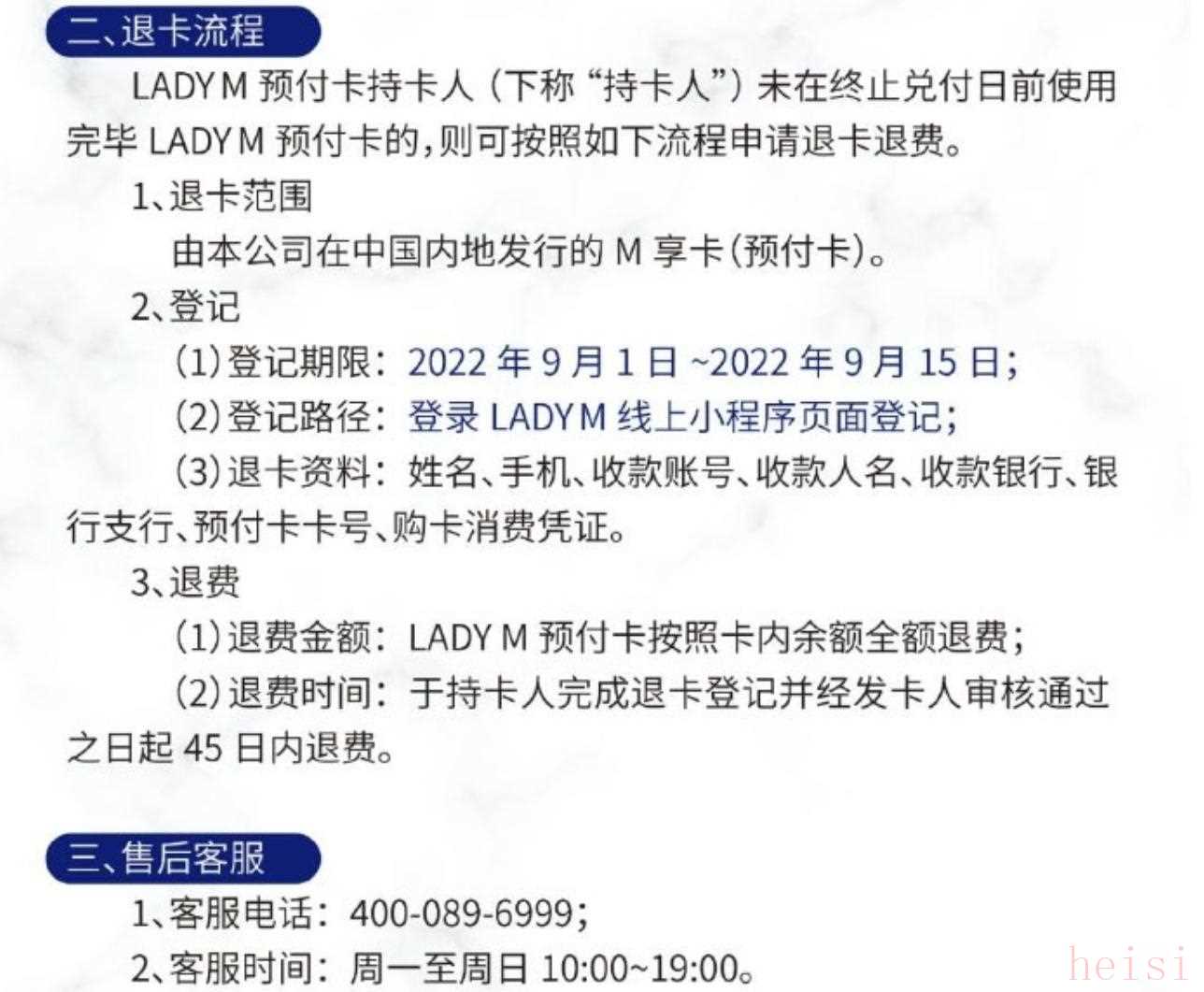公告顯示,LADY M中國內(nèi)地所有實(shí)體門店,將于9月10日終止經(jīng)營,該終止經(jīng)營日為LADY M預(yù)付卡的終止兌付日。廣大消費(fèi)者仍可于終止經(jīng)營日前,到LADY M實(shí)體門店及線上小程序消費(fèi),也可以按照公告辦理退卡退費(fèi)手續(xù),以免因逾期導(dǎo)致無法使用或無法辦理退卡退費(fèi)。