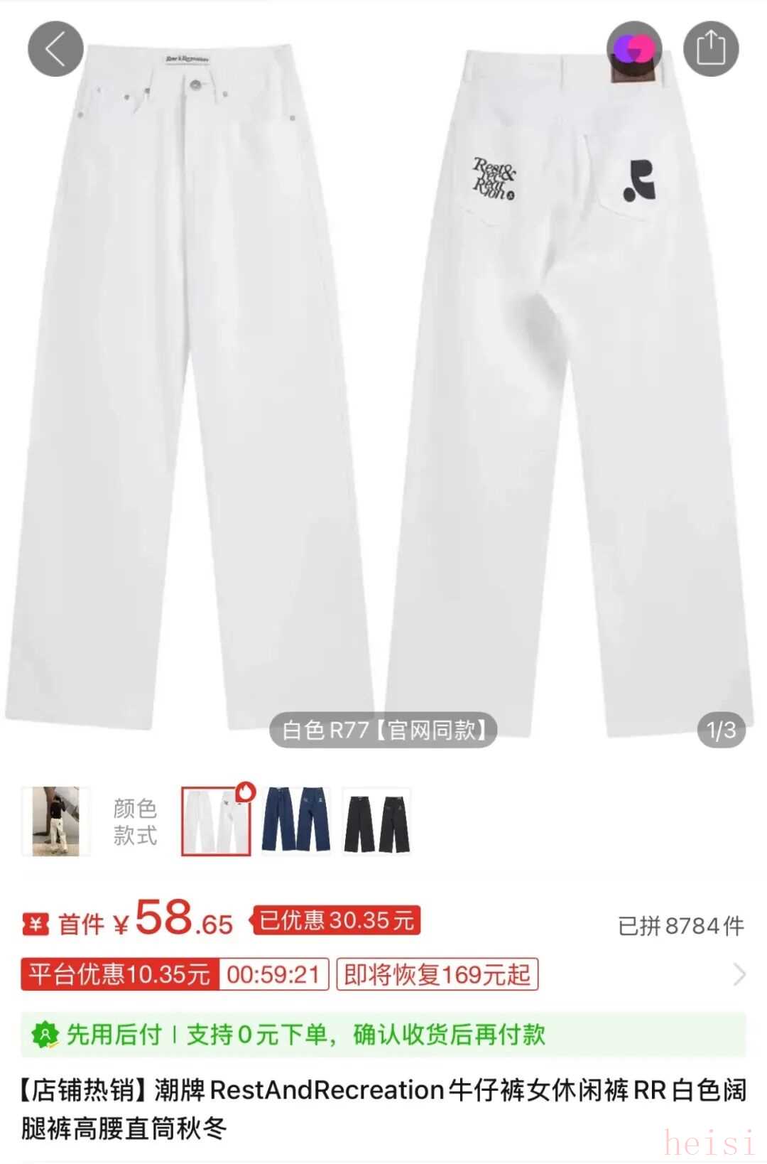 在小紅書,主題為“Jennie最愛韓國(guó)潮牌”的多篇筆記點(diǎn)贊收藏過萬(wàn)。其中比較熱門的品牌Rest&Recreation詞條獲得超4000萬(wàn)瀏覽。在某拼團(tuán)平臺(tái),Jennie同款Rest & Recreation白色牛仔褲單鏈接已拼超8000條。