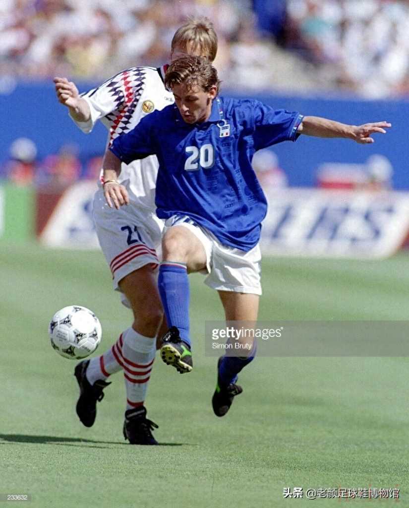 1994年世界杯他穿的diadora為意大利隊(duì)設(shè)計(jì)的藍(lán)色brasil,這款鞋沒(méi)有市售,也是世界杯賽場(chǎng)上出現(xiàn)的最早的非黑色球鞋。