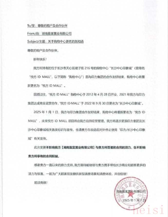 1月7日,湖南盈富置業(yè)有限公司發(fā)布告知函,宣布其位于長(zhǎng)沙市天心區(qū)坡子街216號(hào)的購(gòu)物中心“長(zhǎng)沙中心印象城”(原“悅方ID MALL”)因與印力集團(tuán)的合作已友好結(jié)束,將重新更名為“長(zhǎng)沙悅方ID MALL”。