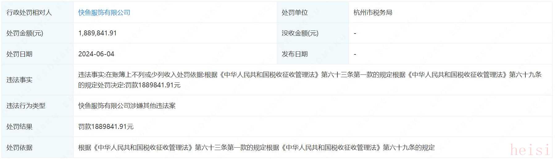 近日,杭州一知名服裝企業(yè)快魚服飾有限公司(下文簡稱:快魚)在企查查上顯示因為在賬簿上不列或者少列收入,被杭州稅務局罰款188.98萬元。