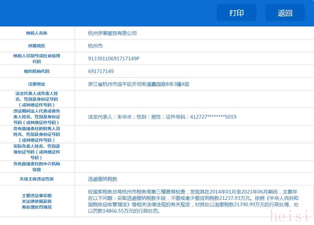 去年2月,杭州市稅務局發(fā)布了對于伊裳的處罰,公司曾在2014年-2021年6月間,通過逃避繳納稅款手段,不繳或者少繳2.14億元,根據(jù)相關法律法規(guī),處罰1.49億元。兩者相加需要補繳超3.6億元。