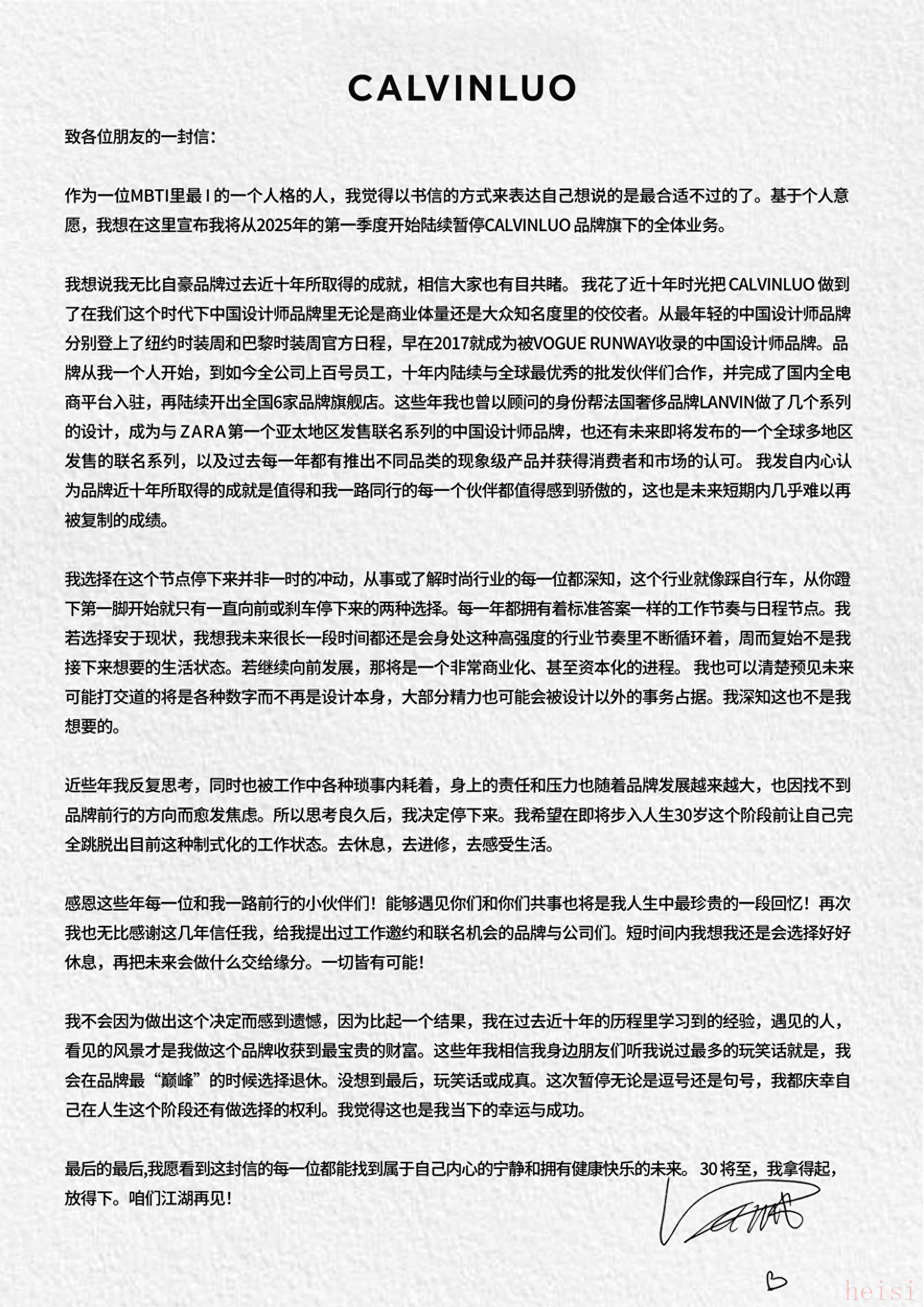 2. "停業(yè)消息":大約在2023年11月,CALVINLUO 通過官方渠道(如微博)發(fā)布聲明,宣布因“經(jīng)營不善”和“資金鏈斷裂”等原因,品牌將正式停業(yè)。聲明中感謝了所有顧客、合作伙伴和員工的支持。