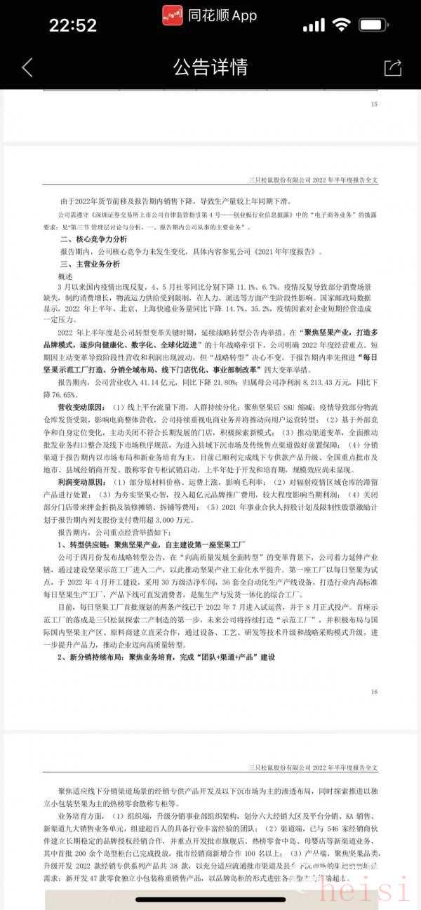 利潤下降的原因,三只松鼠表示,報告期內(nèi)部分原材料價格、運費上漲,影響毛利率;投入超億元品牌推廣費用,較大程度影響當期利潤;關(guān)閉部分門店帶來押金折損及裝修攤銷、拆鋪等費用,這些門店,三只松鼠提到是不符合長期發(fā)展的門店。