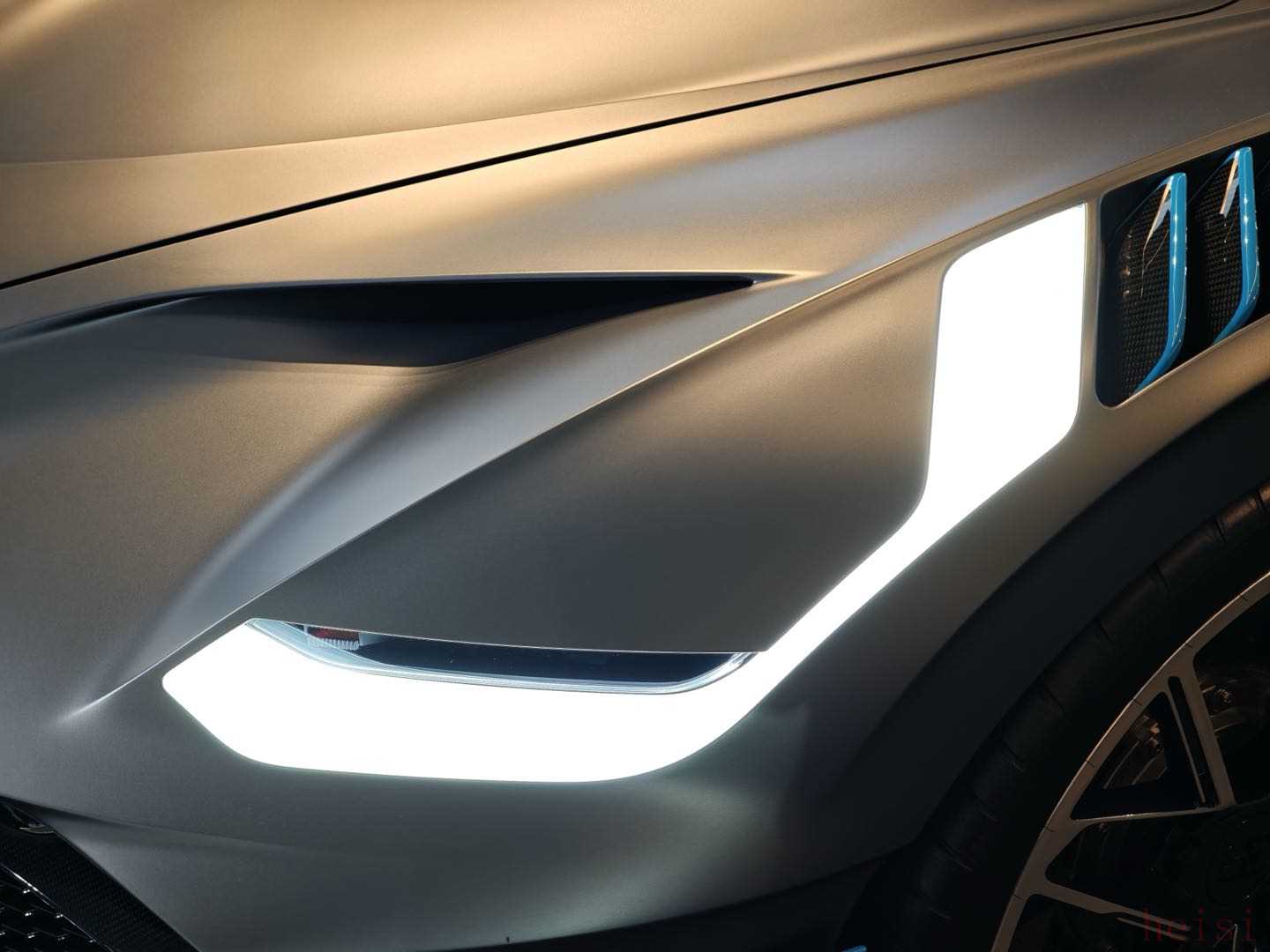 布加迪Divo車頭有著布加迪經(jīng)典的馬蹄形前格柵和藍色中心標志線,提供大型前擾流板、前部進氣口、前艙蓋上的通風口、側(cè)裙、前輪拱上的通風口等空氣動力學設(shè)計。