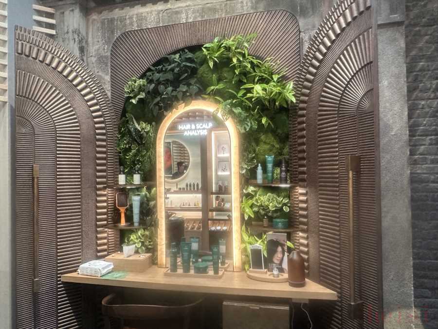 記者走進(jìn)門店的第一感受就是,“體驗(yàn)”幾乎成為了店內(nèi)的隱藏動(dòng)線。品牌在一樓設(shè)置了“青絲之門”體驗(yàn)區(qū)、浣手區(qū)、Chakra能量香氛區(qū)、Shampure區(qū)、植萃體驗(yàn)區(qū)等。例如,“青絲之門”體驗(yàn)區(qū)配備了800倍顯微檢測(cè)儀器,能清晰呈現(xiàn)頭皮、毛囊及秀發(fā)的健康狀況?,F(xiàn)場(chǎng)工作人員介紹,該體驗(yàn)區(qū)能提供個(gè)性化方案,讓消費(fèi)者通過(guò)產(chǎn)品試用感受精細(xì)化護(hù)理。