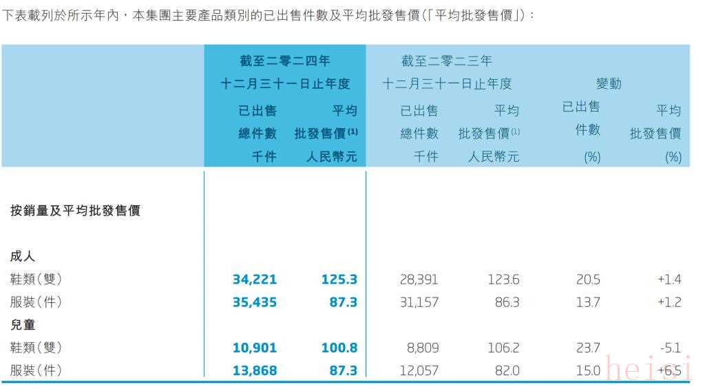 財(cái)報(bào)顯示,去年361度各主要產(chǎn)品類別均錄得可喜的增長(zhǎng)率,銷量均錄得顯著增長(zhǎng)。其中在售價(jià)方面,鑒于市場(chǎng)競(jìng)爭(zhēng)激烈,盡管集團(tuán)產(chǎn)品的市場(chǎng)需求仍強(qiáng)勁,但集團(tuán)并未大幅上調(diào)成人鞋服產(chǎn)品的平均批發(fā)售價(jià)。
