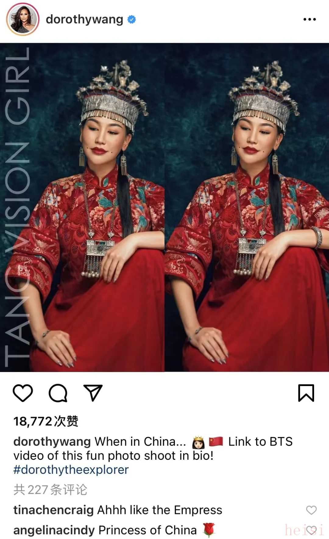 作為在美國土生土長的富二代移民,Dorothy是對中國有著堅定認同感的代表,除了上面的拍攝,之前的DG事件也能窺見她的立場。