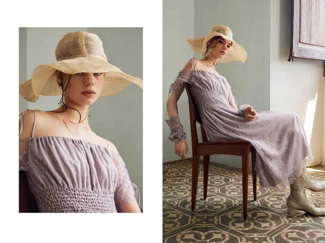 比如品牌標志性的波浪邊寬檐草帽,帽檐自然下垂,形成幾何趣味造型,材質更是輕如細紗,薄如蟬翼,涼爽透風,視覺上輕盈而仙氣四溢!