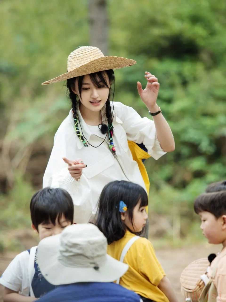以彩色發(fā)帶扎著雙麻花辮的鄭爽頭戴翹檐草帽,造型清甜自在!