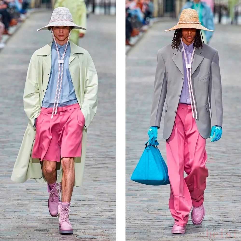 布置在帶有咖啡館風情的Place Dauphine上,Louis Vuitton 2020春夏秀場上展示了伴有狹長帽繩的尖頭弧頂?shù)膶掗苊保⒁悦装?、薰衣草紫、藍莓黑等漿果色演繹,完美平衡了街頭與華麗兩種看似矛盾的氣質!