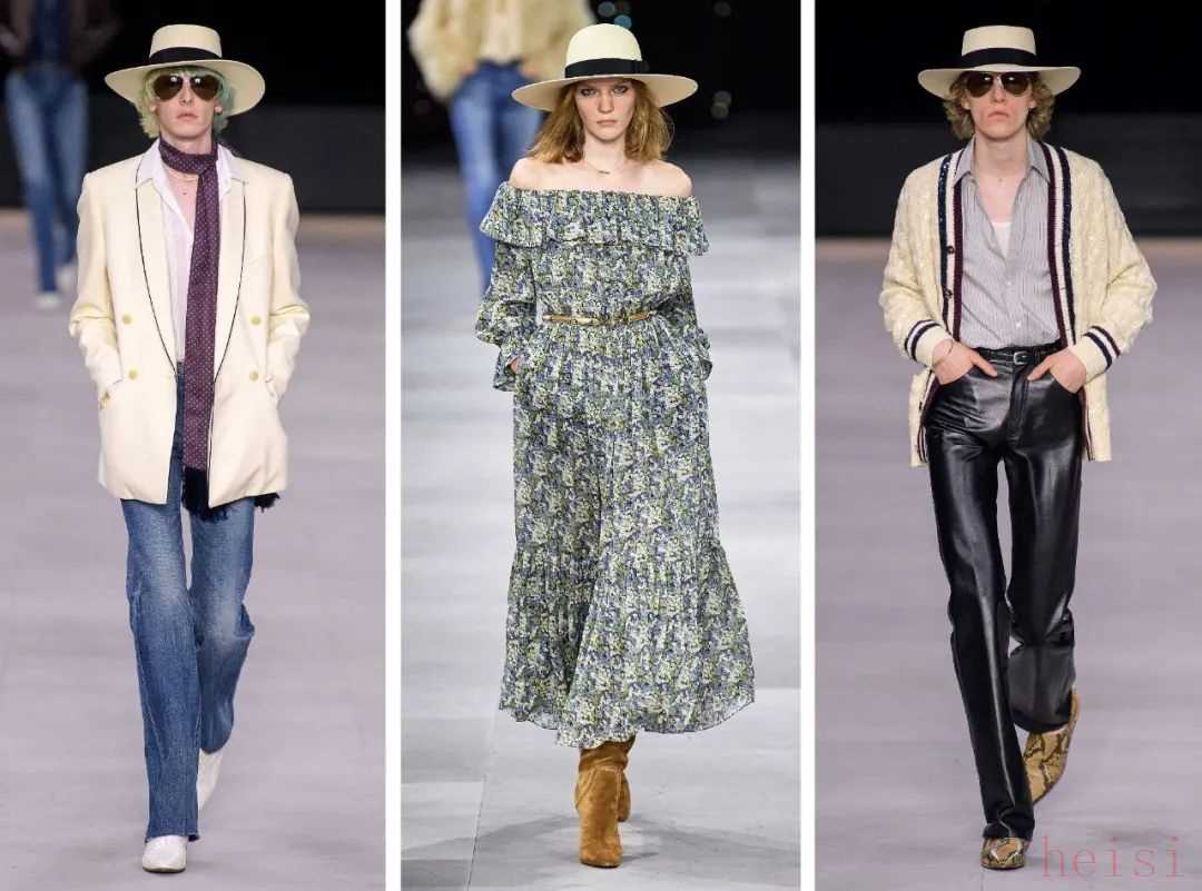 在Celine 2020春夏秀場上同樣出現(xiàn)了草帽的身影,其中成衣線的寬檐草帽設計以穹頂,柔美得體,男裝線的寬檐草帽則采用平頂,率性瀟灑,卻都體現(xiàn)出Hedi Slimane致敬上世紀60-70年代的復古情懷!