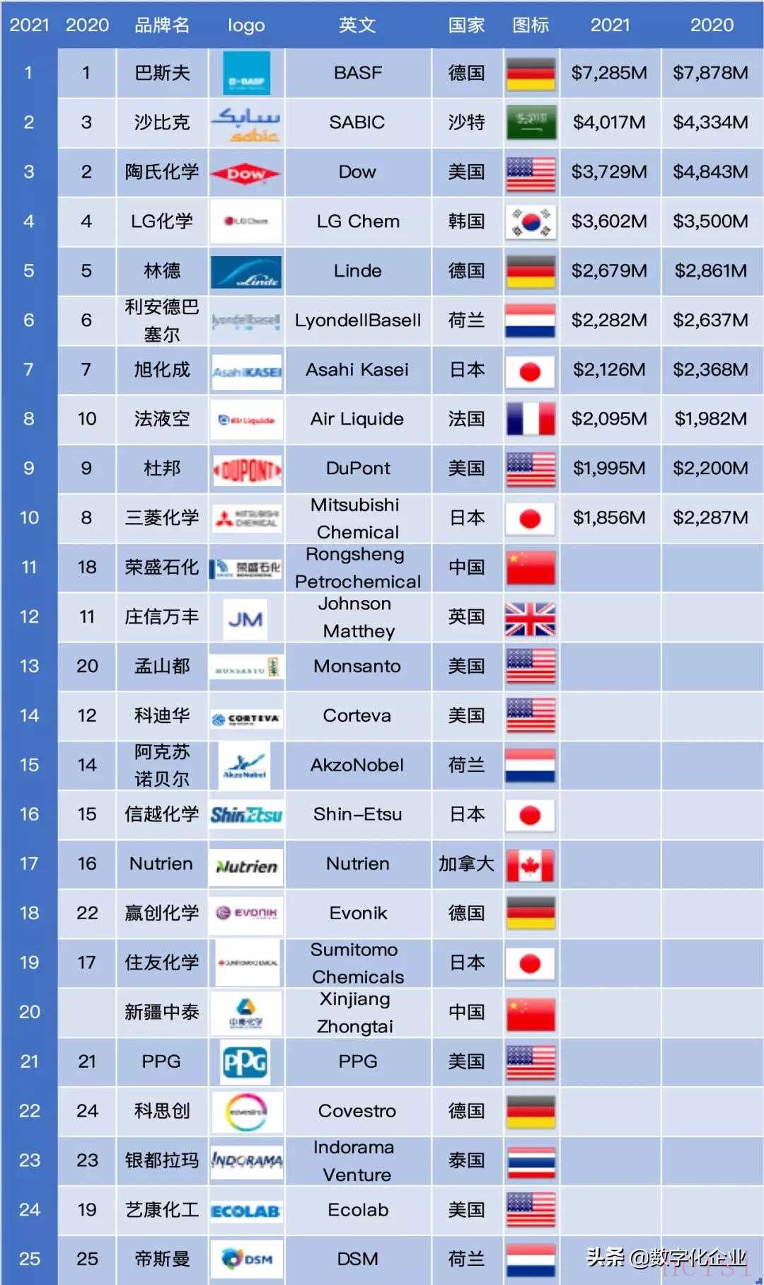 根據(jù)權(quán)威的市場(chǎng)研究機(jī)構(gòu)Grand View Research發(fā)布的報(bào)告,2021年全球化工品牌25強(qiáng)名單已經(jīng)出爐。