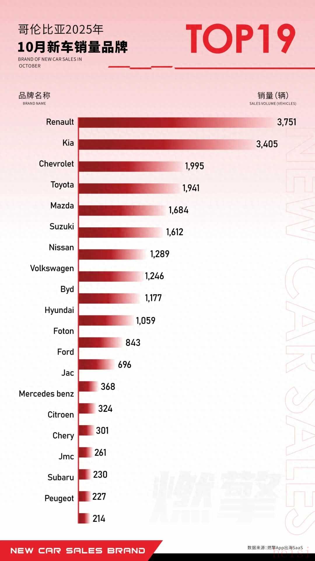 10月哥倫比亞新車(chē)市場(chǎng)呈現(xiàn)雷諾、起亞雙雄領(lǐng)跑,傳統(tǒng)國(guó)際品牌分層競(jìng)爭(zhēng),中國(guó)品牌多維度滲透的格局。雷諾、起亞的頭部地位短期內(nèi)仍將延續(xù);中國(guó)品牌可通過(guò)比亞迪的新能源技術(shù)迭代、商用車(chē)品牌的本地化運(yùn)營(yíng)(如建立KD工廠、拓展服務(wù)網(wǎng)絡(luò))進(jìn)一步擴(kuò)大份額;傳統(tǒng)國(guó)際品牌若不加速經(jīng)濟(jì)型產(chǎn)品的電動(dòng)化轉(zhuǎn)型,市場(chǎng)空間或持續(xù)被本土品牌與中國(guó)品牌擠壓。哥倫比亞市場(chǎng)也將成為中國(guó)品牌在拉美出海的典型樣本。一、雷諾、起亞以性?xún)r(jià)比壟斷頭部雷諾以3751輛登頂,起亞以3405輛緊隨其后。二者憑借本地化經(jīng)濟(jì)型車(chē)型矩陣(如小型轎車(chē)、入門(mén)SUV)、價(jià)格競(jìng)爭(zhēng)力,牢牢占據(jù)哥倫比亞市場(chǎng)基本盤(pán),成為當(dāng)?shù)叵M(fèi)者“實(shí)用型購(gòu)車(chē)”的首選,銷(xiāo)量規(guī)模遠(yuǎn)超其他品牌,形成第一梯隊(duì)壁壘。二、傳統(tǒng)國(guó)際品牌分層競(jìng)爭(zhēng)美系、日系代表:雪佛蘭(1995輛)、豐田(1941輛)處于第二梯隊(duì),依托品牌認(rèn)知和全球化車(chē)型(如雪佛蘭皮卡、豐田卡羅拉系列),在中端市場(chǎng)維持份額,但銷(xiāo)量?jī)H為雷諾、起亞的一半左右,競(jìng)爭(zhēng)力被本土與韓系品牌分流。德系、韓系分化:大眾(1246輛)、現(xiàn)代(1059輛)銷(xiāo)量處于中下游,反映出其在哥倫比亞市場(chǎng)的產(chǎn)品適配性或價(jià)格策略未能有效擊中主流需求,份額持續(xù)收縮。三、中國(guó)品牌多維度突圍新能源代表比亞迪:以1177輛上榜,憑借電動(dòng)化技術(shù)(如刀片電池、純電平臺(tái))切入哥倫比亞新能源細(xì)分市場(chǎng),成為中國(guó)品牌在當(dāng)?shù)匦履茉促惖赖摹皹?biāo)桿”,體現(xiàn)技術(shù)出海的成效。商用車(chē)與乘用車(chē)矩陣:福田(843輛)、江淮(696輛)、奇瑞(301輛)、Jmc(261輛)等品牌覆蓋商用車(chē)、入門(mén)乘用車(chē)領(lǐng)域,通過(guò)高性?xún)r(jià)比策略+多品類(lèi)布局實(shí)現(xiàn)市場(chǎng)滲透,標(biāo)志著中國(guó)品牌在哥倫比亞從單一產(chǎn)品出海轉(zhuǎn)向“全品類(lèi)矩陣”突圍。四、豪華品牌與小眾品牌邊緣化奔馳(368輛)、雪鐵龍(324輛)、標(biāo)致(227輛)等品牌銷(xiāo)量低迷,反映出哥倫比亞市場(chǎng)以經(jīng)濟(jì)型消費(fèi)為主導(dǎo),豪華品牌的溢價(jià)空間被嚴(yán)重壓縮,僅能在小眾高端市場(chǎng)維持微弱存在感。
