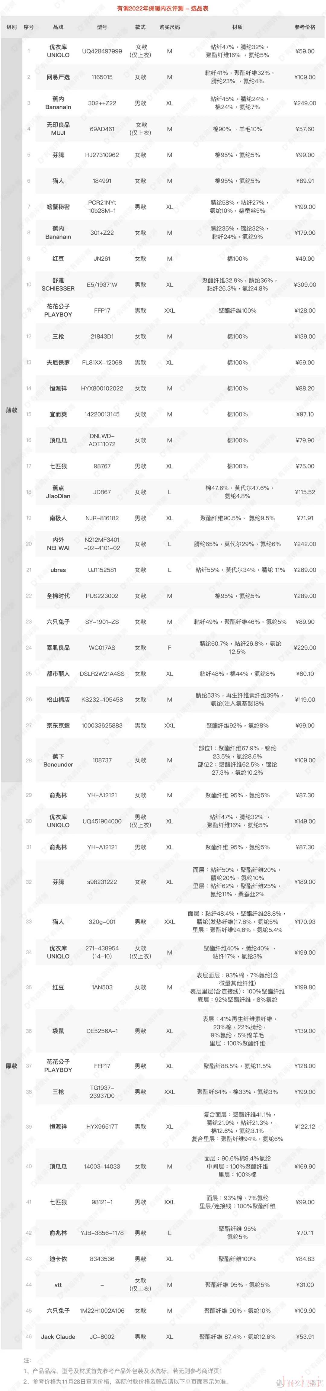 按照厚度,分成了薄款和厚款兩組,總共購買了46款保暖內衣來進行評測。