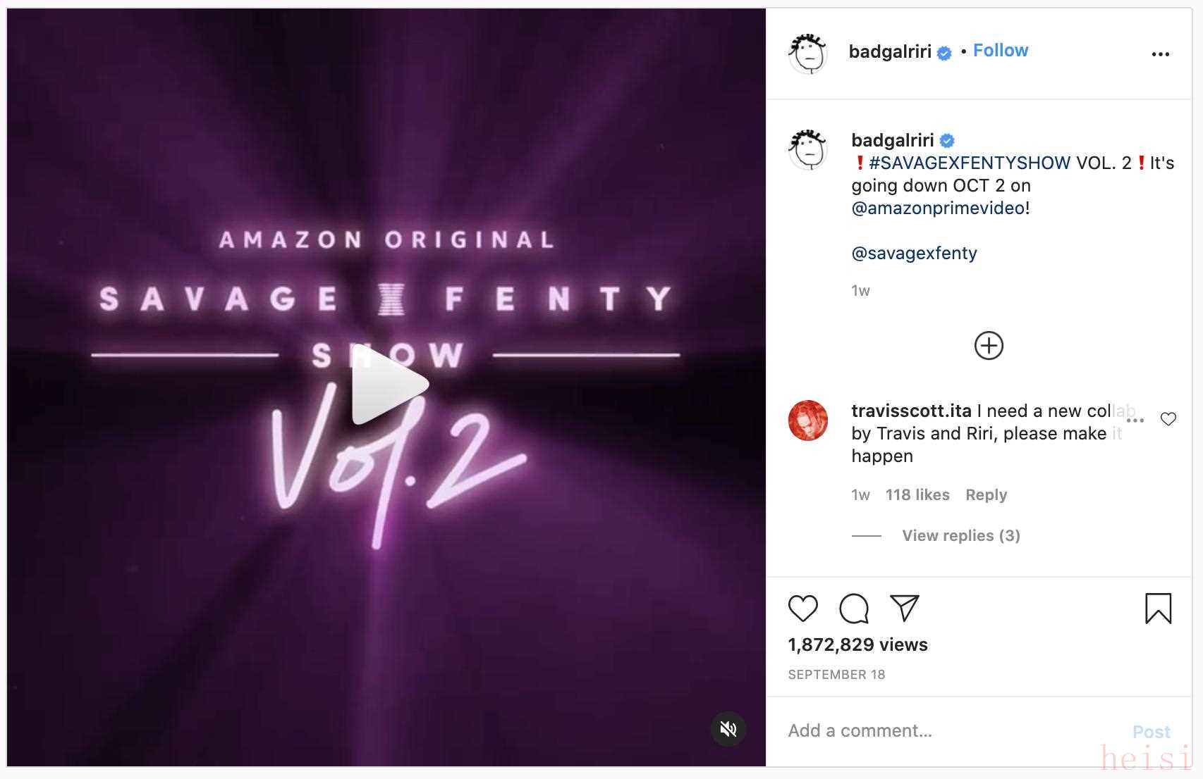 此前,蕾哈娜在Instagram上公布了這場(chǎng)內(nèi)衣時(shí)裝秀還將繼續(xù)和Amazon Video聯(lián)合呈現(xiàn)。表演嘉賓的陣容將包括嘻哈明星Travis Scott, 西班牙唱作歌手Rosalía, 美國(guó)歌手Miguel等一系列的明星。