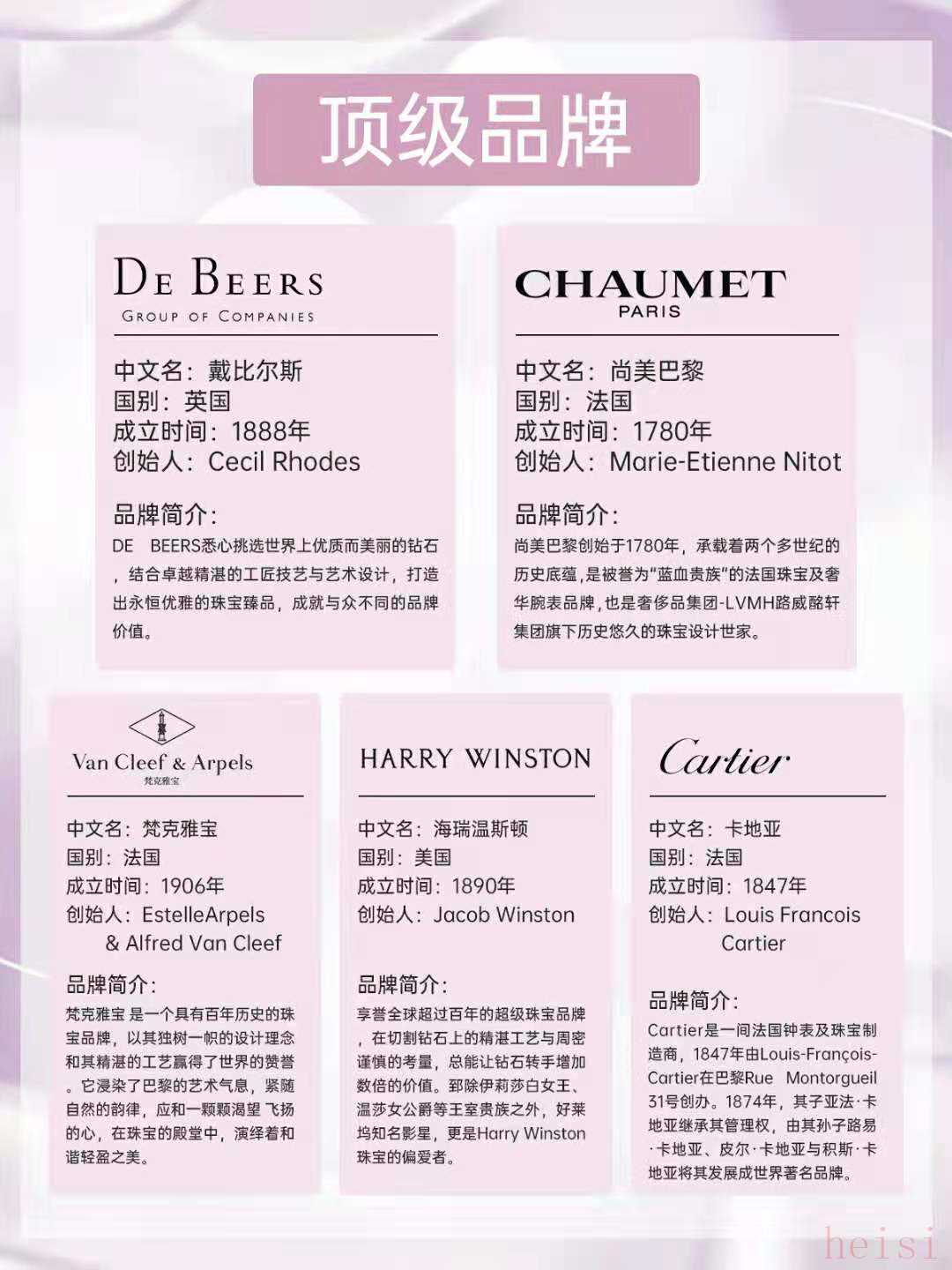 頂級(jí)品牌:尚美巴黎 Chaumet、梵克雅寶VCA、海瑞溫斯頓HW、卡地亞 Catier