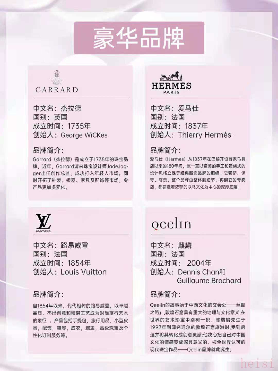 豪華品牌:杰拉德、路易威登、愛(ài)馬仕Hermes、麒麟 Qeelin。